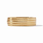 This wide, statement-making oval bangle is comprised of golden ridges that are lightly hammered to softly scatter the light. Intricate patterned piecework adorns the inside for lightness and luxury.