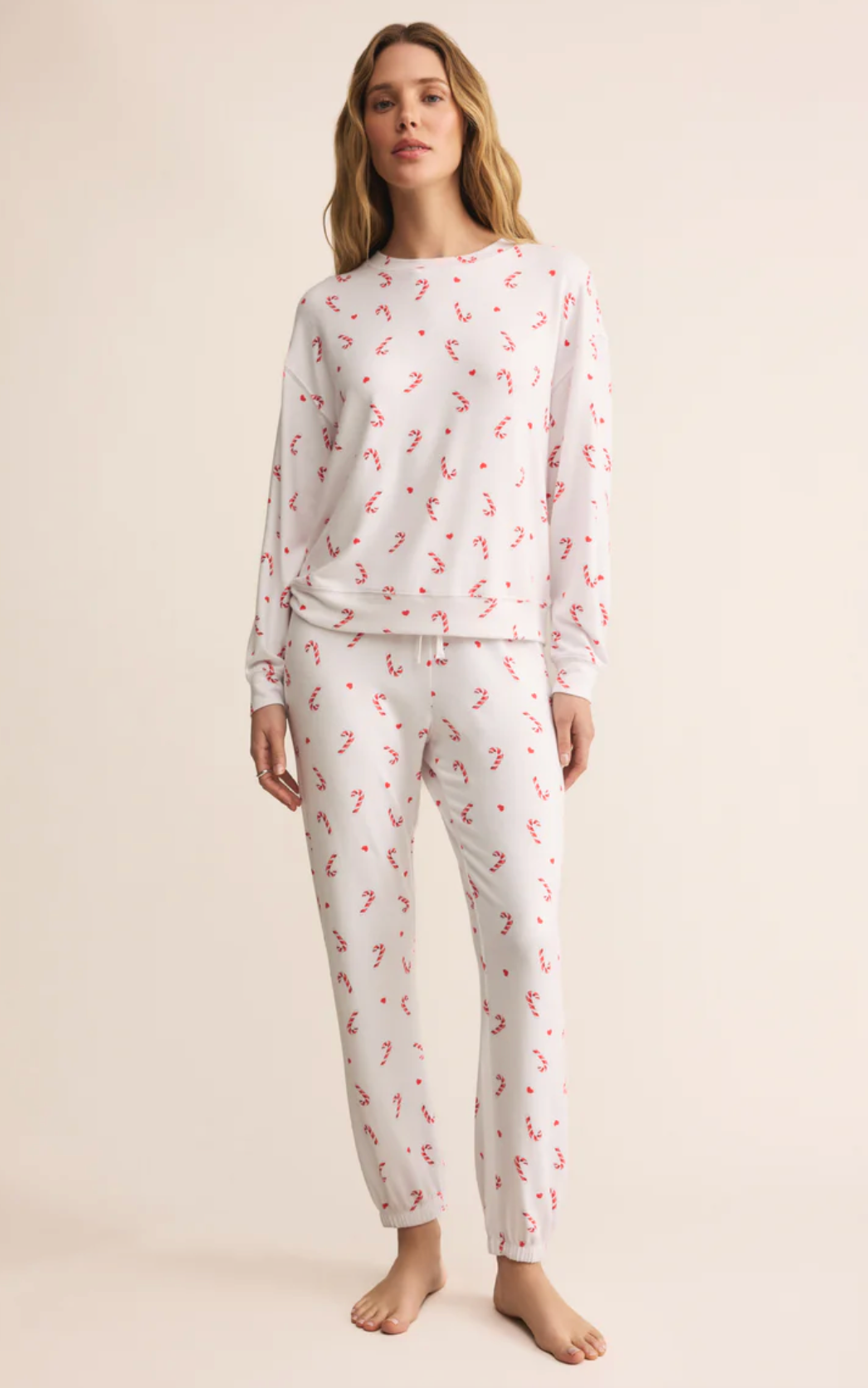 Sweet and seasonal, this relaxed set is crafted in silky jersey with a playful candy cane print. With a classic crew neck top and high-rise jogger, it’s the kind of festive cozy she’ll want all winter long.