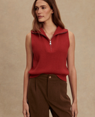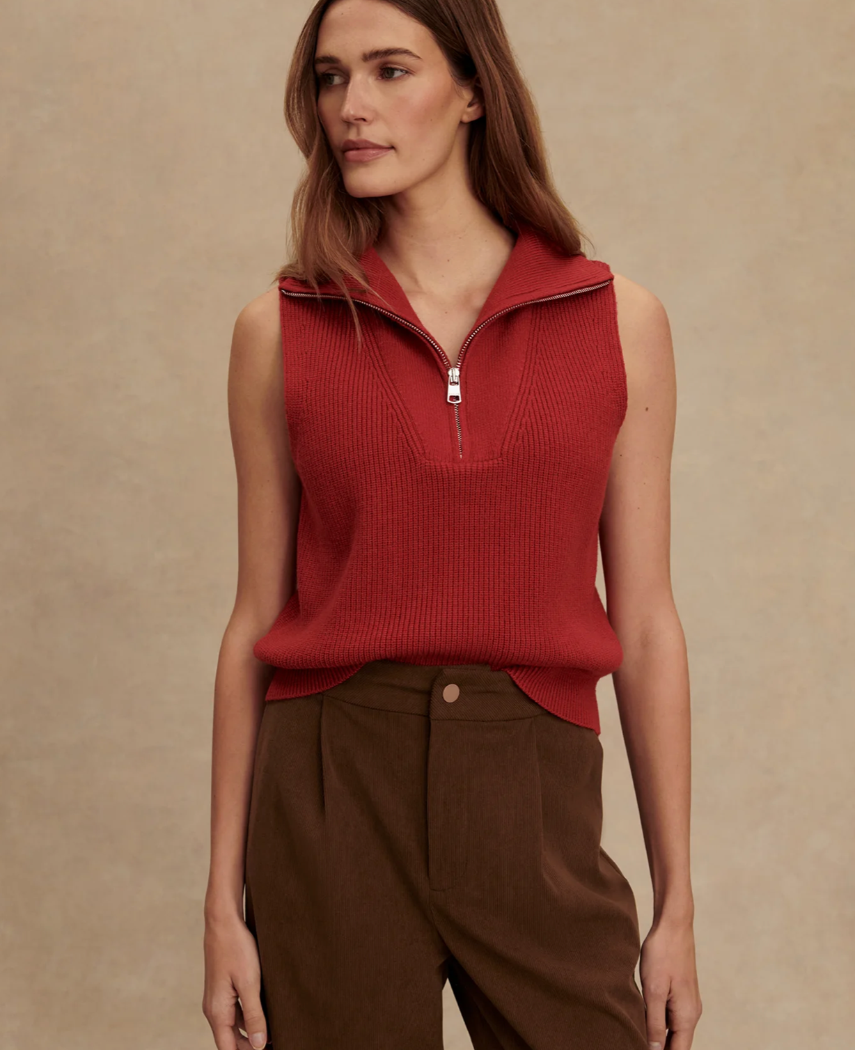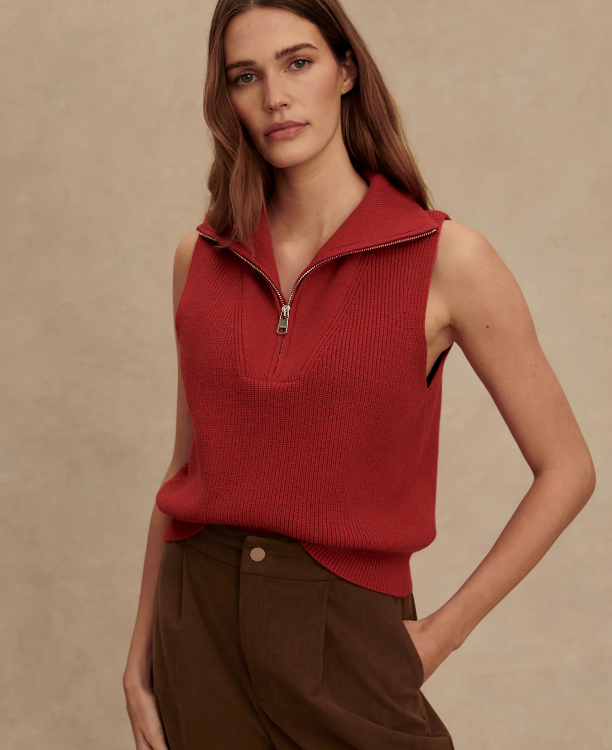 Elegant and versatile, the Amina is designed to be layered or worn solo alike. Crafted from a Soft Viscose knit with all-over rib, this sleeveless staple has a clean, elevated design with a half-zip collar and elegant detailing around the placket.
