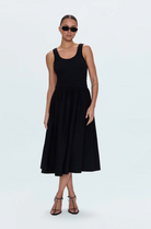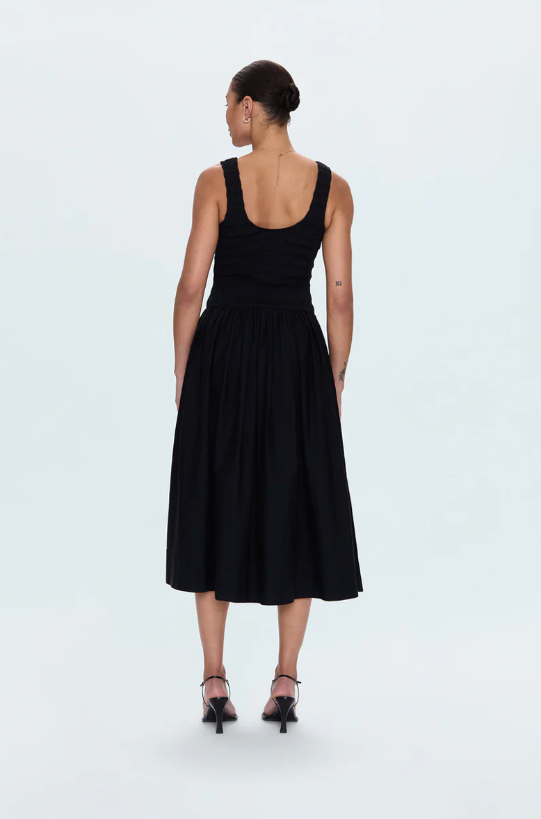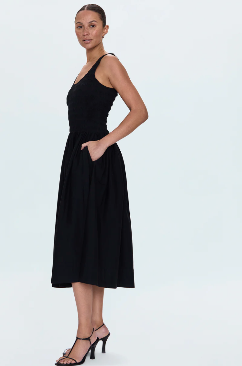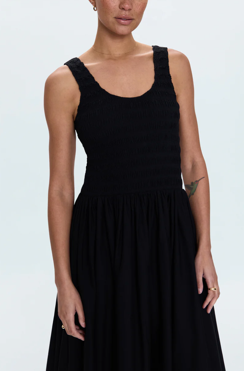 Textured day dress crafted from a lightweight fabrication designed with warm weather in mind. Featuring a smocked tank style bodice that falls into a ruched waistband and a fully proportioned midi skirt.