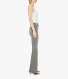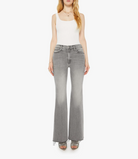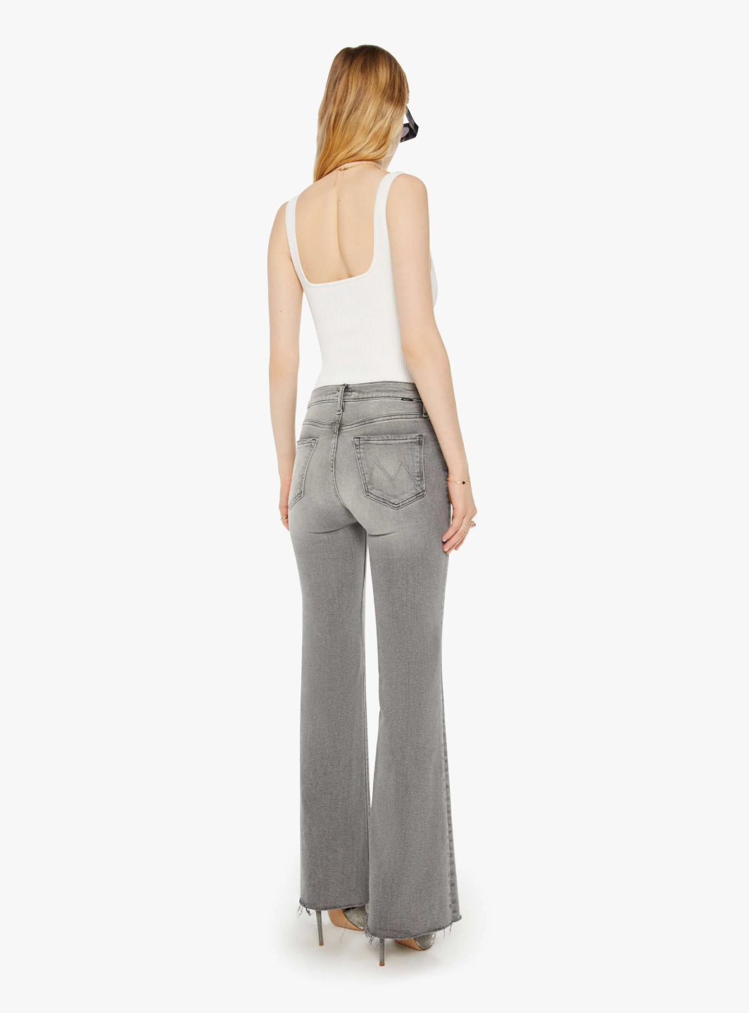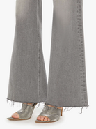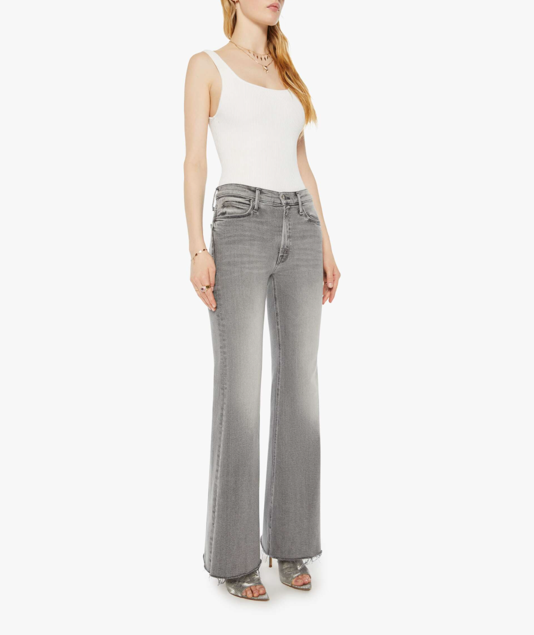 Take a hike. A high-rise flare with a long 32-inch inseam, zip fly and a frayed hem. Made from stretch denim, Catch Me Outside is light grey with whiskering and fading at the knee.