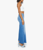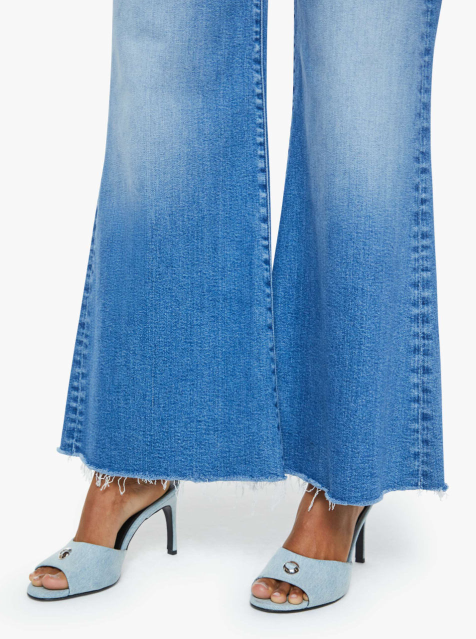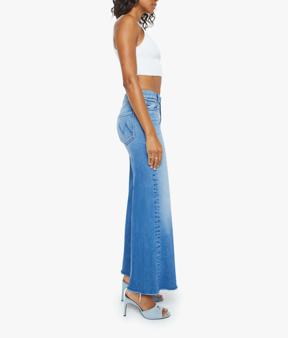 Crowd pleaser. This iconic high-waisted wide leg has a 31-inch inseam and a frayed hem. Cut from stretch denim, Fan Favorite is a mid-blue with whiskering and fading at the knee.