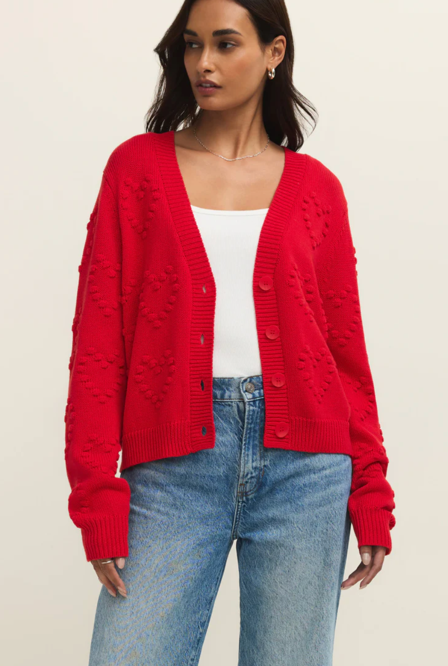 Made from breathable cotton yarn, this cardigan combines cozy texture with a relaxed fit that’s easy to layer. The dimensional heart-stitch detail adds a charming touch to a timeless silhouette you can dress up or down.