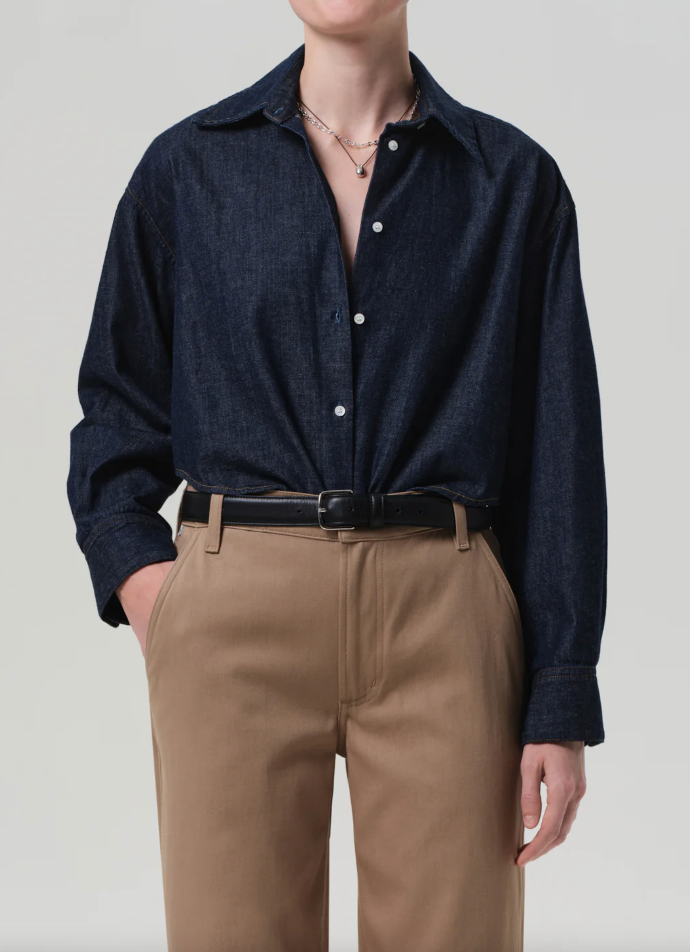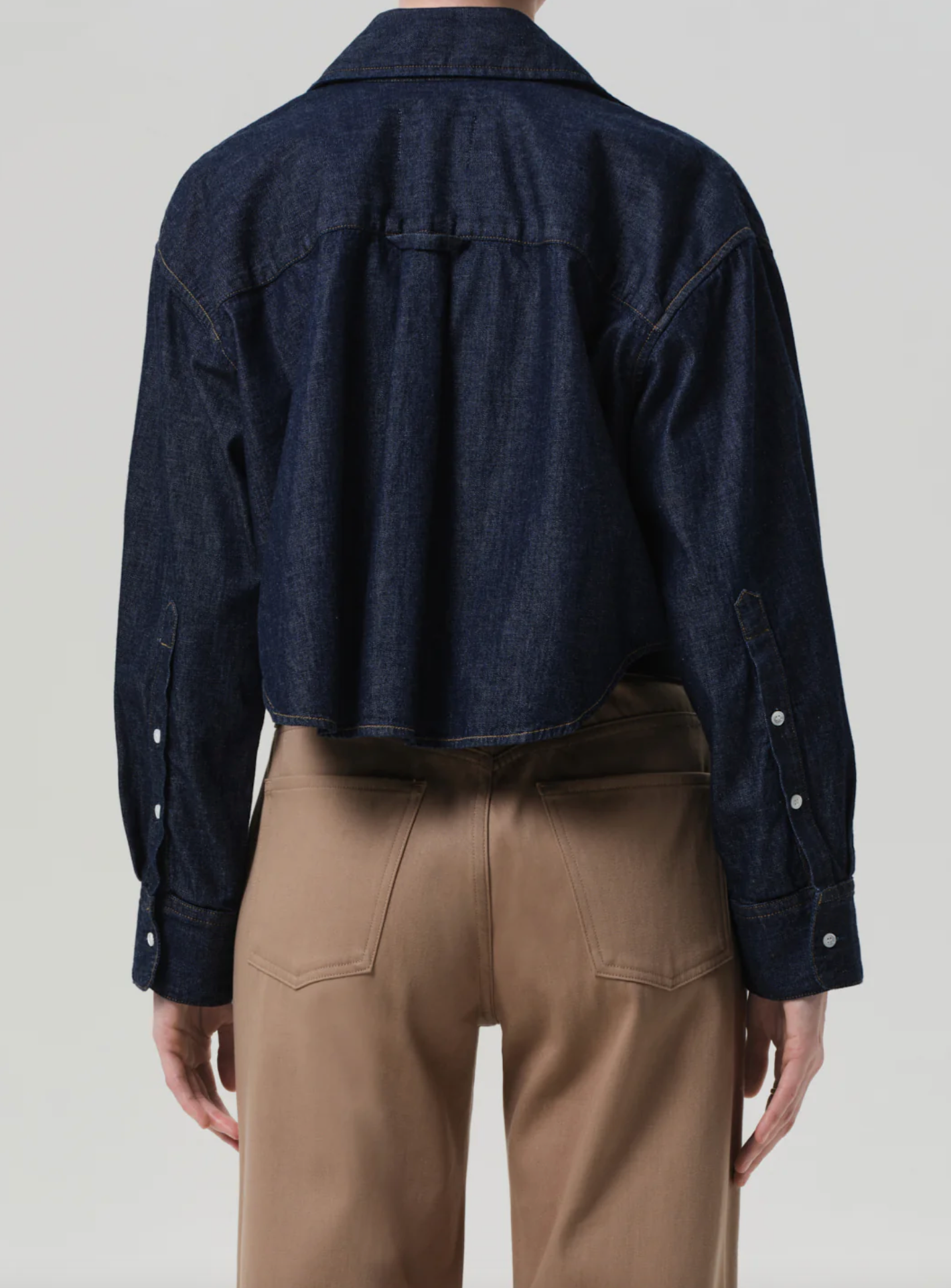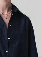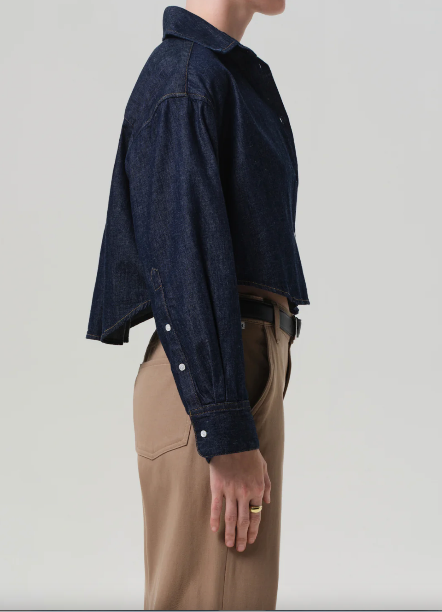 A crisp update to classic shirting, the Ana is reimagined in lightweight Japanese denim with a soft, natural drape. The cropped silhouette and pointed collar lend modern structure, while the deep Piave wash—a rich, dark indigo—keeps the look polished yet relaxed. Pairs well with tonal denim or crisp white trousers.