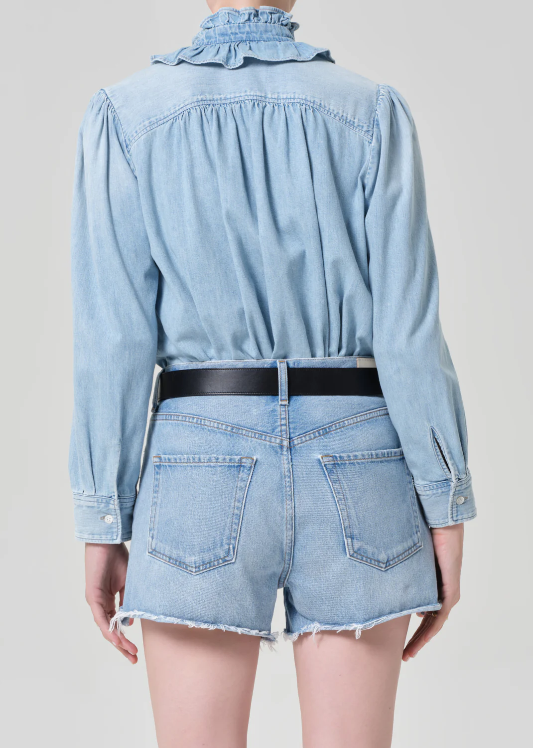 Looks Like: Light indigo long sleeve denim shirt with ruffle tie collar