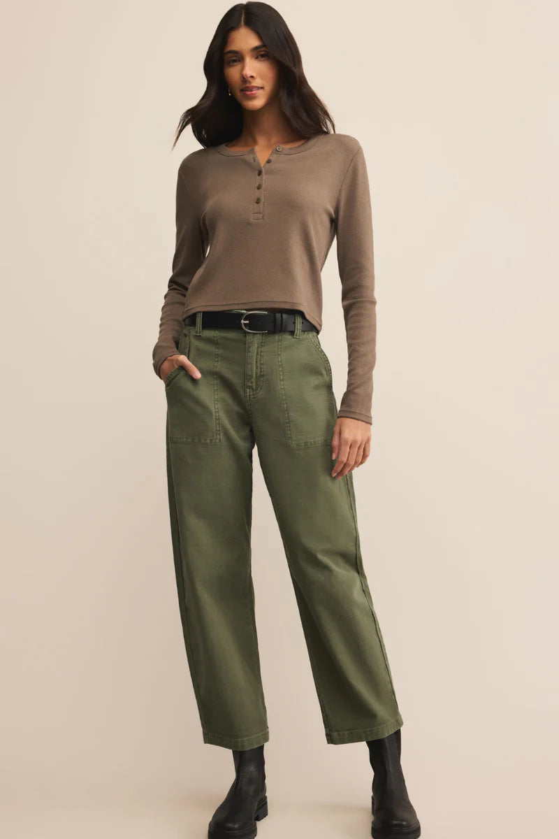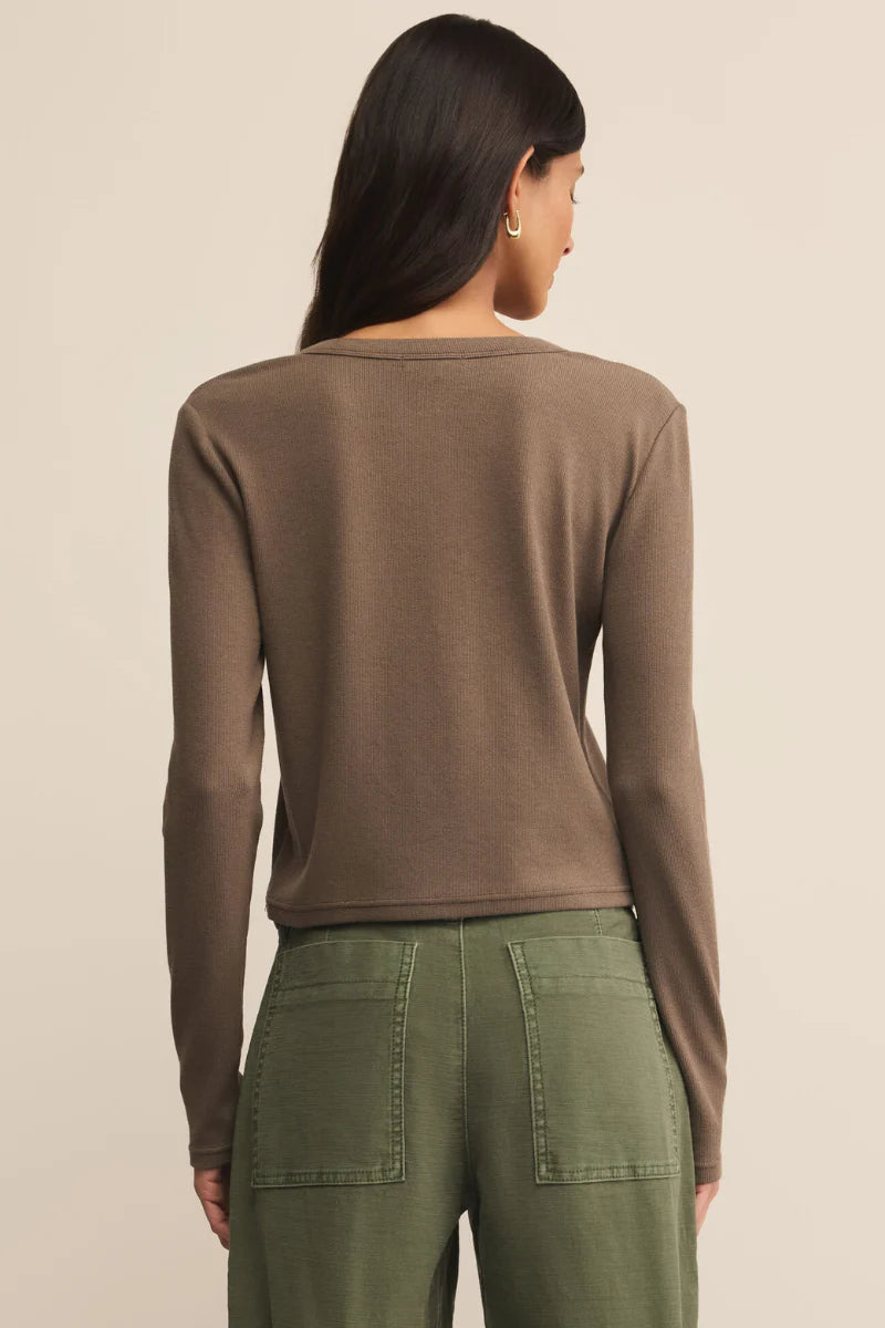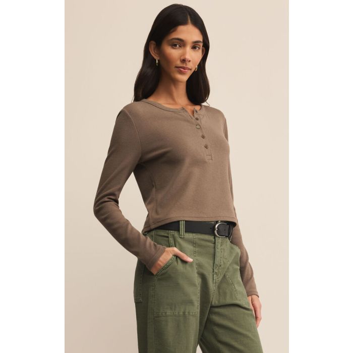 A slightly boxy, cropped henley that keeps things casual but polished. Made with a soft, slub rib knit and finished with a crew neckline, button front, and long sleeves, it’s the kind of top you’ll reach for on repeat.