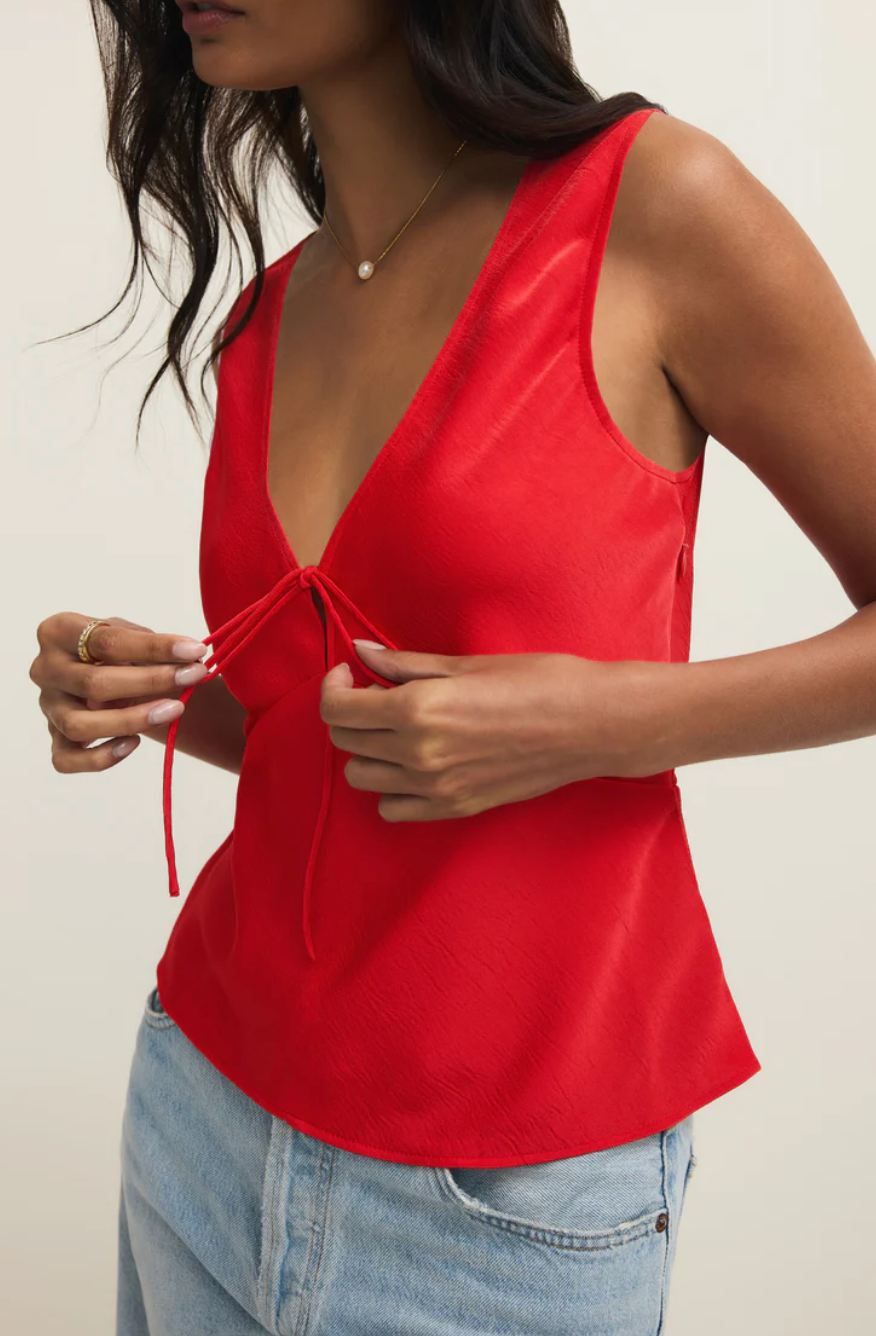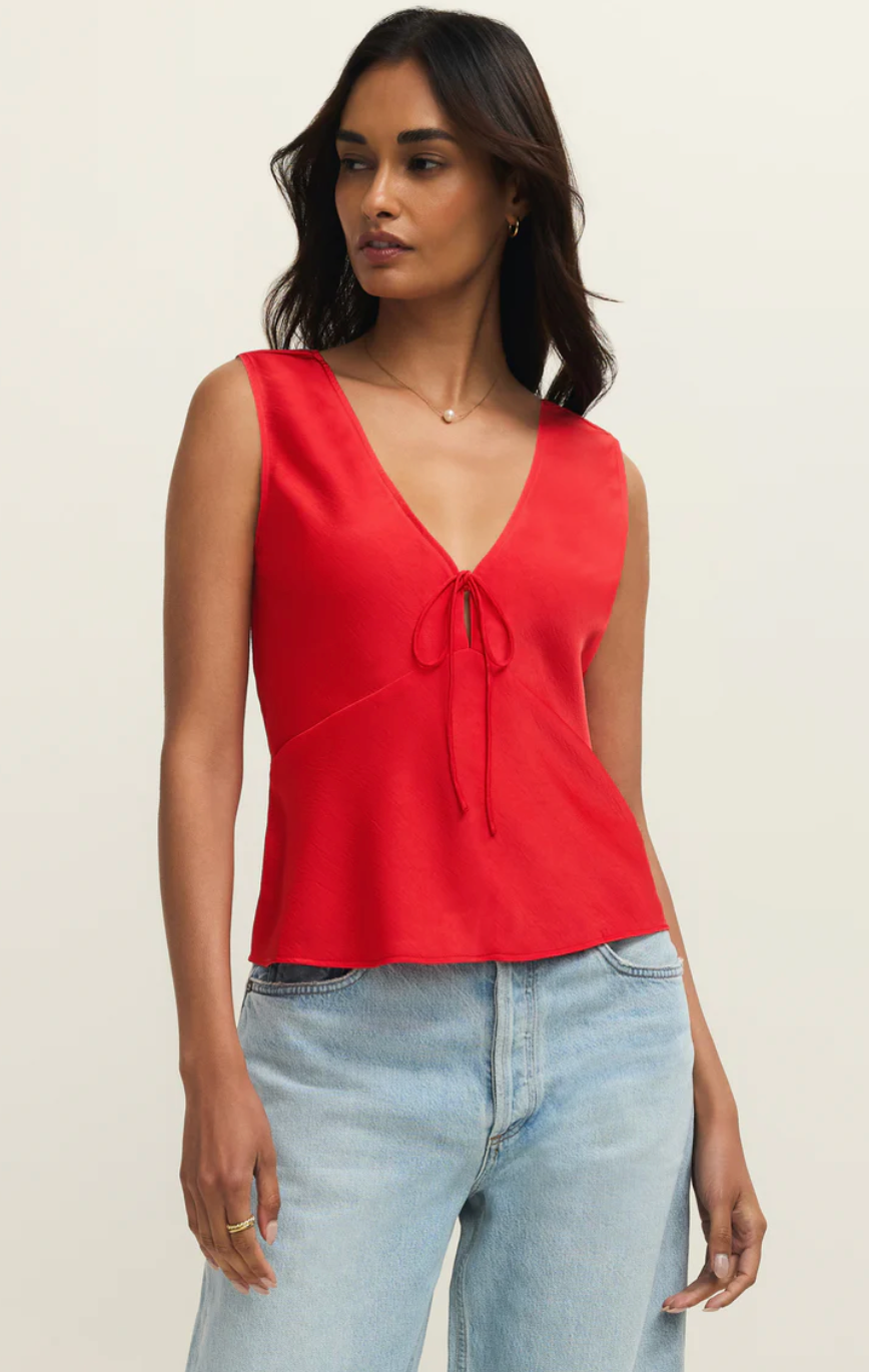Soft and silky with a subtle sheen, this satin tank brings a touch of femininity to your look. The front tie detail adds just the right amount of interest, whether worn alone or layered under a jacket for an elevated finish.