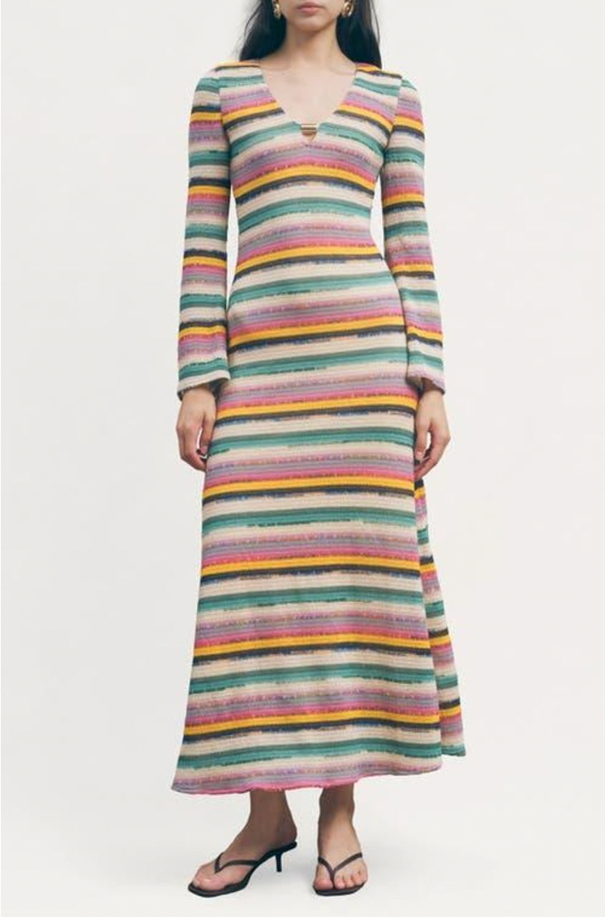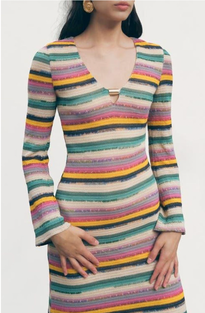 Colorful stripes make a bright, bold statement on this A-line knit dress complete with polished hardware at the neckline.