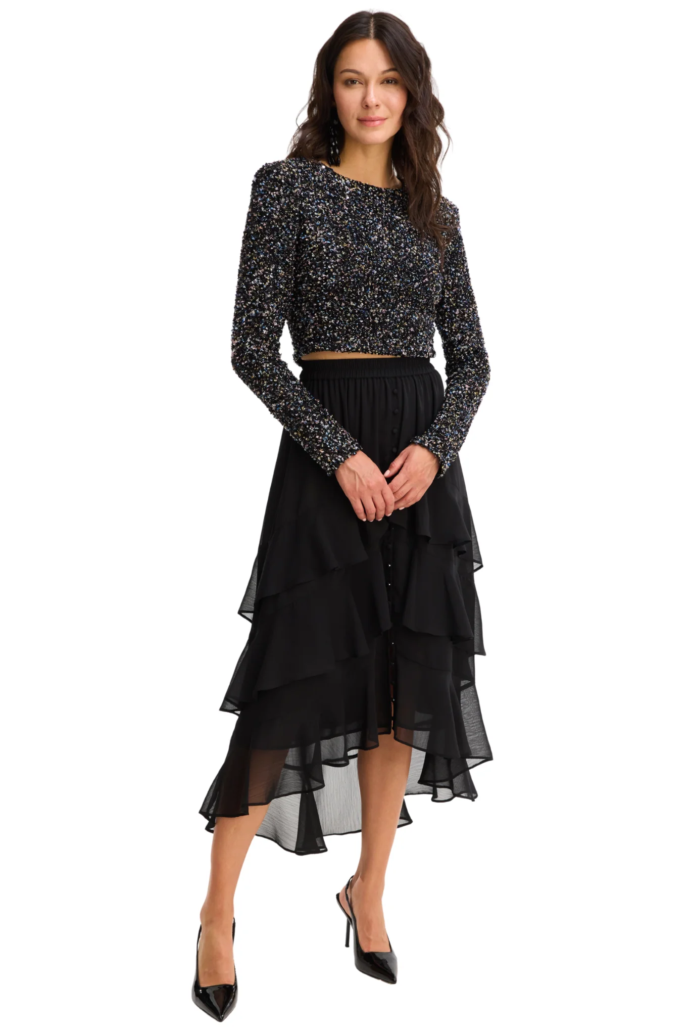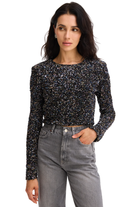 The Rory Top is a sparkle dream perfect for going out with a little glam. Designed with a multicolored lightweight boucle fabric covered in black sequins. We wanted to keep the shape structured with removable shoulder pads. Slightly fitted and cropped in length with a center back zipper closure. Ends just below the natural waist — will not show skin when paired with high waisted bottoms.