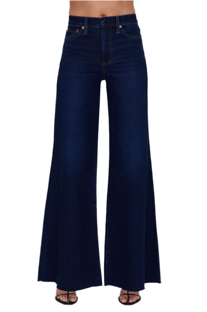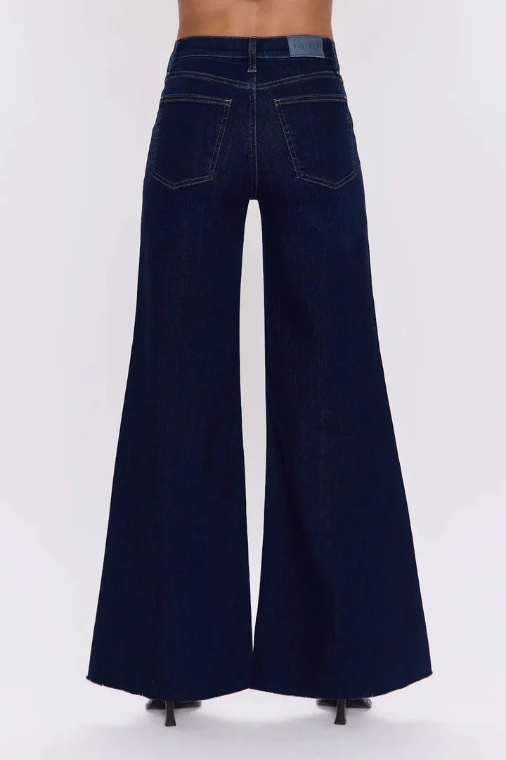 The Izzy mid rise wide leg showcases an slim top block and exaggerated wide leg silhouette with an unexpected kick flare to hem.