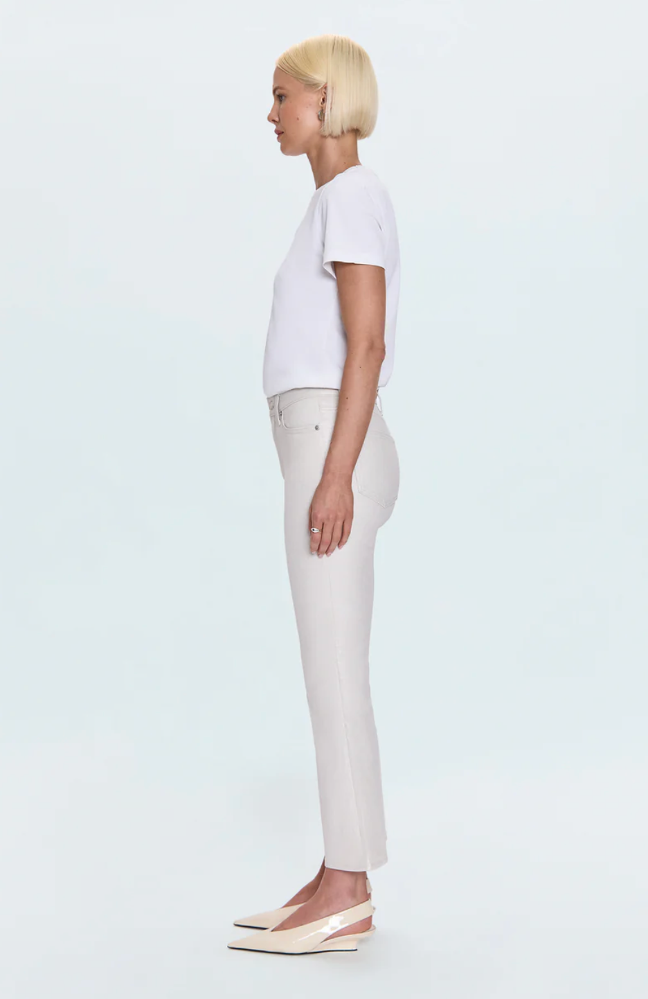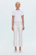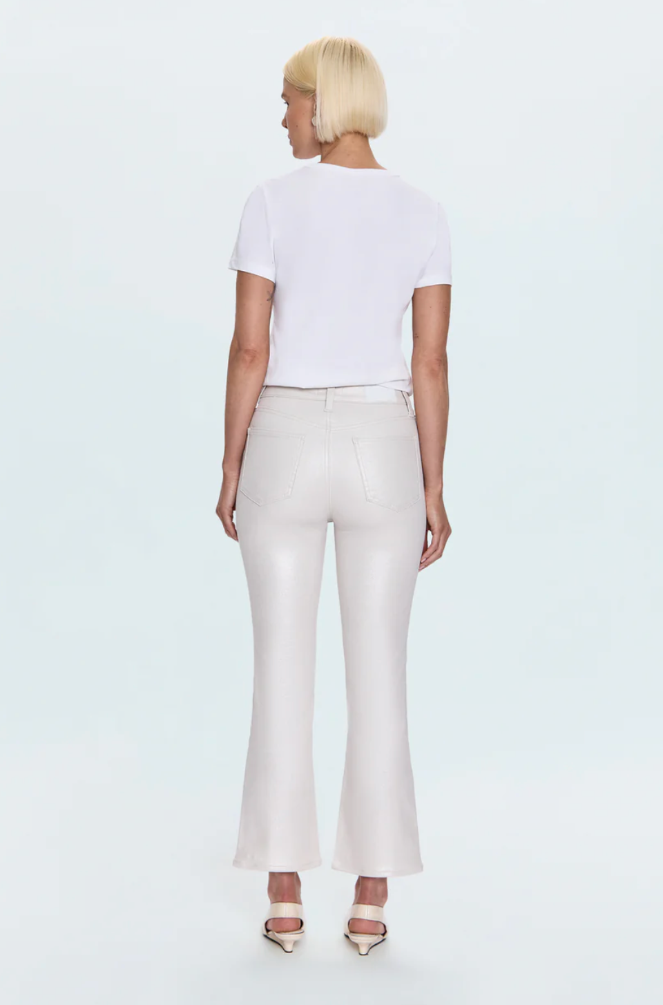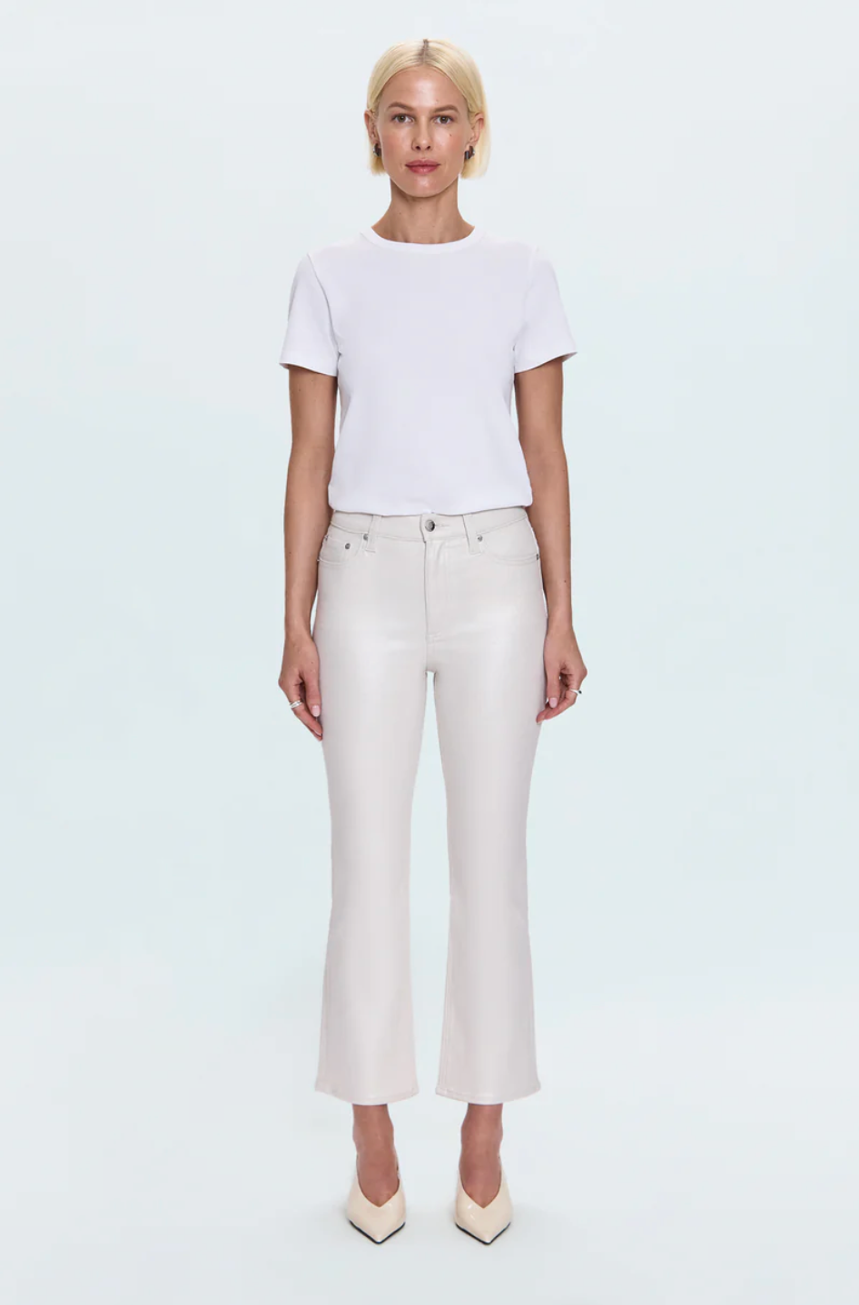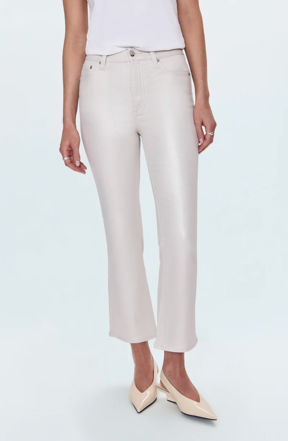 A modern take on the classic bootcut, Lennon features a high rise and slim fit through the hips and thighs before subtly flaring at the calf for balanced proportion. The cropped 27" inseam flatters every shoe, from heels to flats. Crafted from high-stretch fabric in Ivory Luster, a pearly off-white with a sleek coated finish that adds soft sheen and elevated polish.