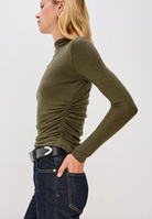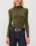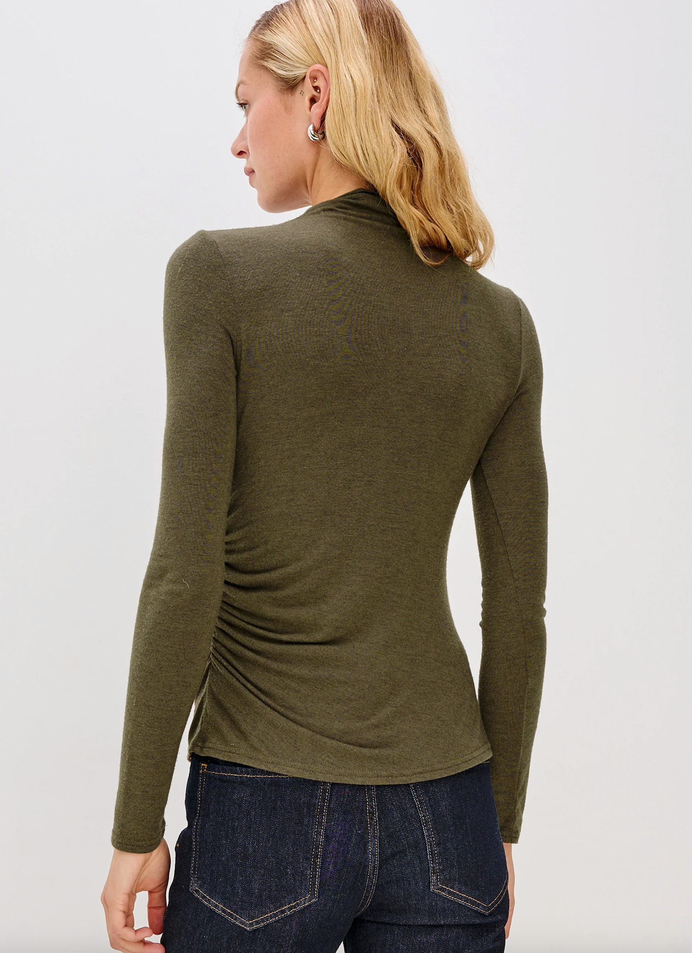 A modern take on the classic long sleeve, the Joelle top is crafted from a soft gauge jersey with an asymmetrical mock neck with shirring details from the right shoulder.