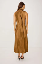 Effortlessly eye-catching, the Lorenza is a midi-length dress in luxuriously silky fabric with a lustrous sheen, featuring a V-neckline, attached self-tie scarf, and sweeping bias-cut A-line skirt.