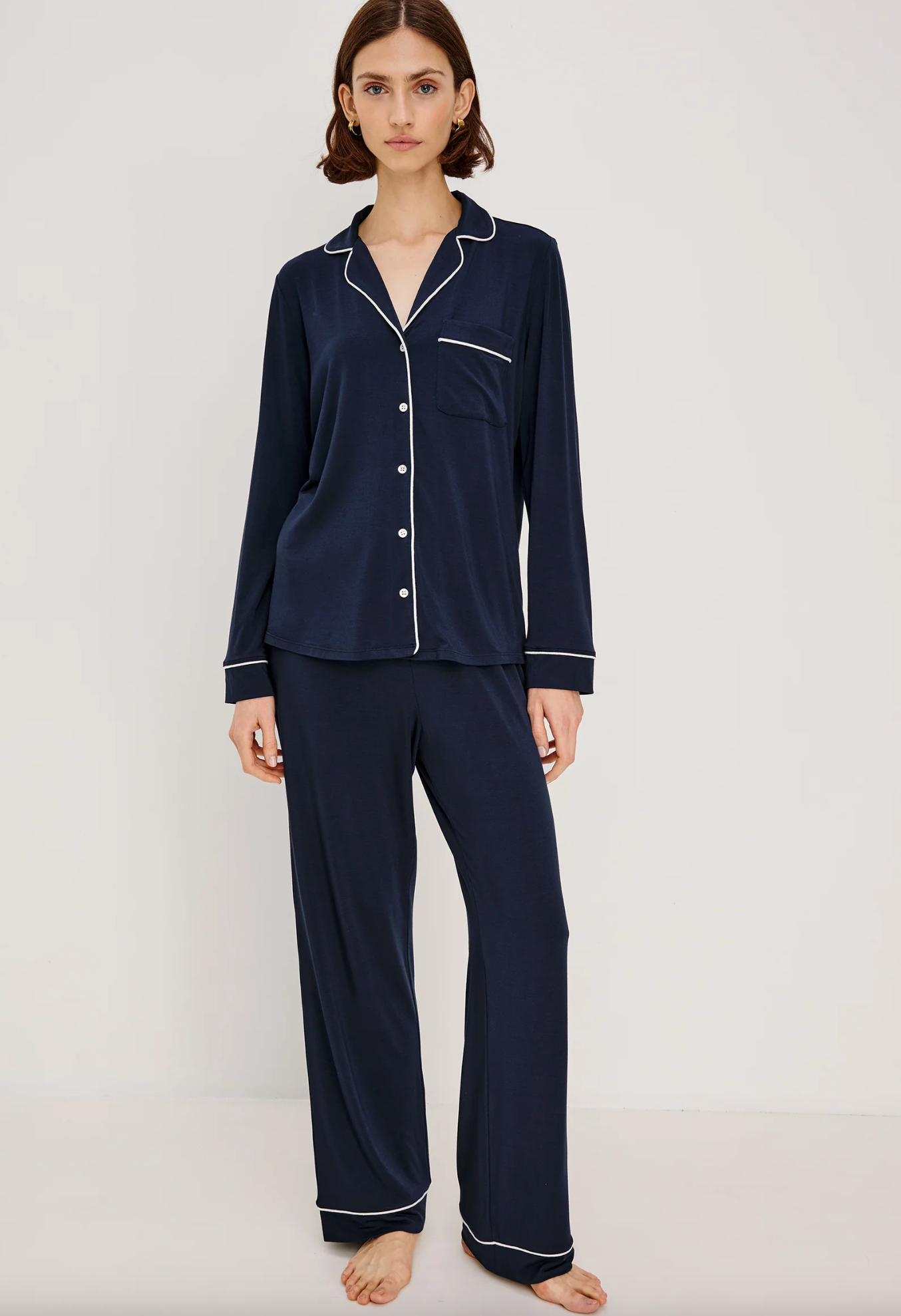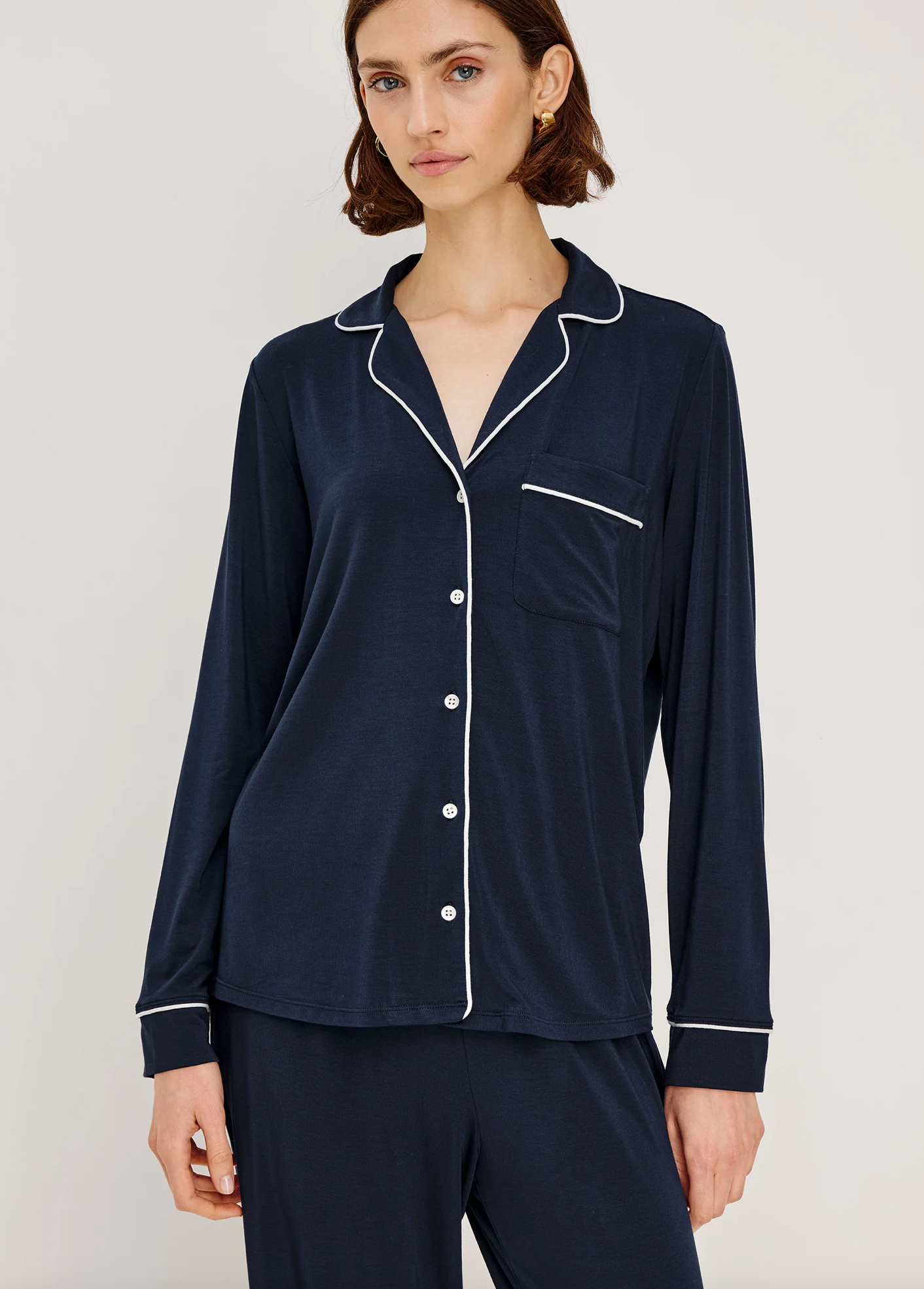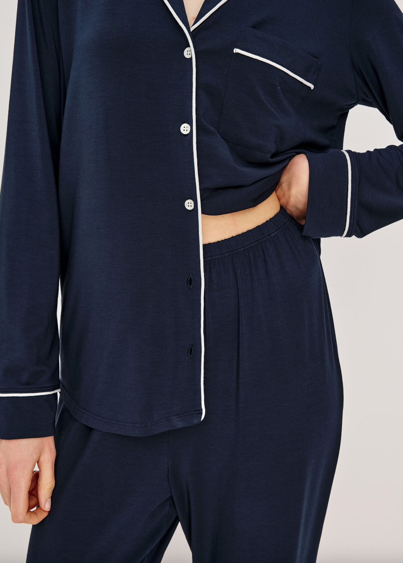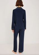 Effortless comfort perfected, the Varra is a matching pajama set crafted from soft, drapey jersey with contrast piping, featuring a loose-fit long-sleeve button-down shirt with front buttons, paired with high-waisted pants.