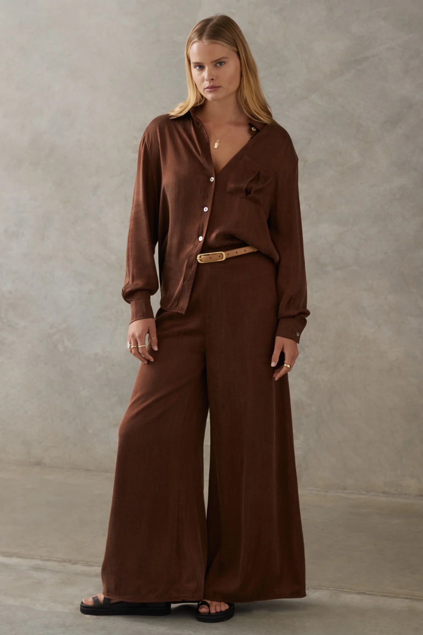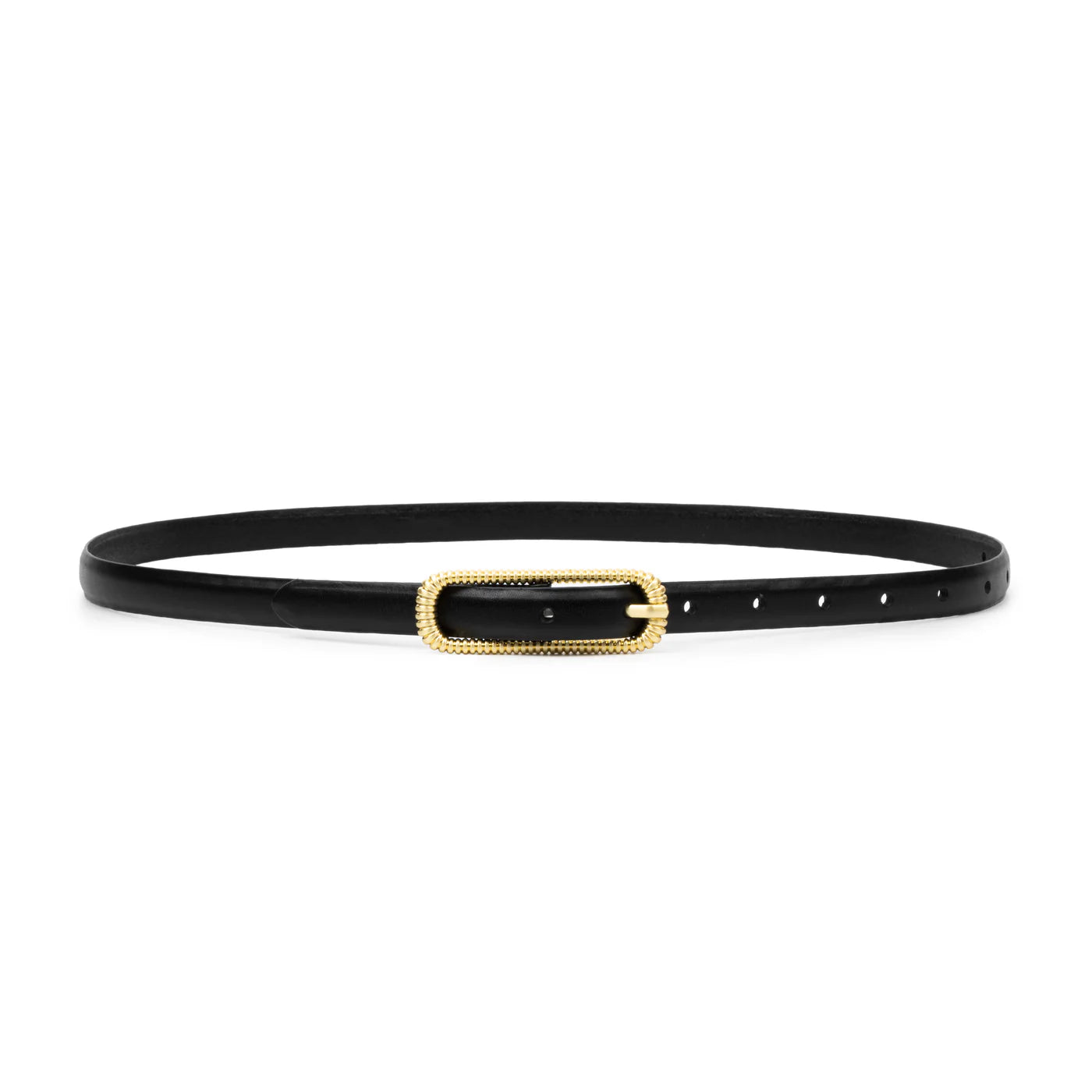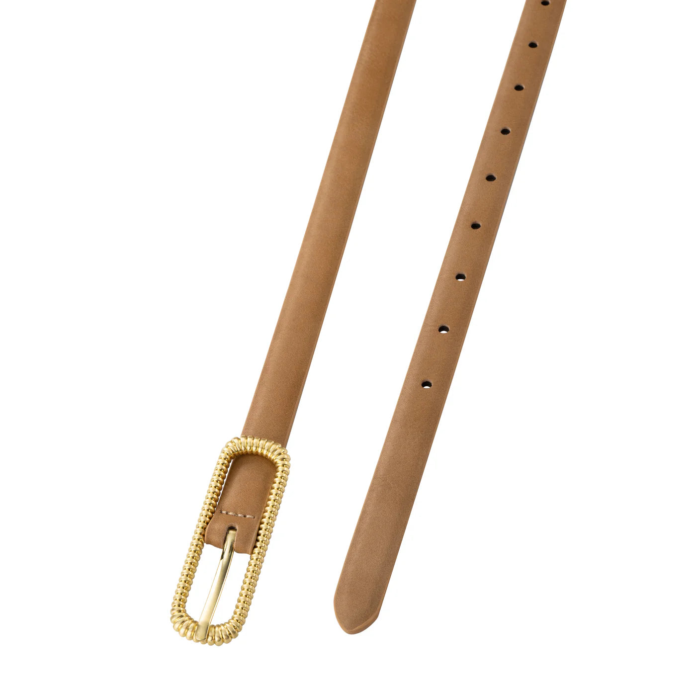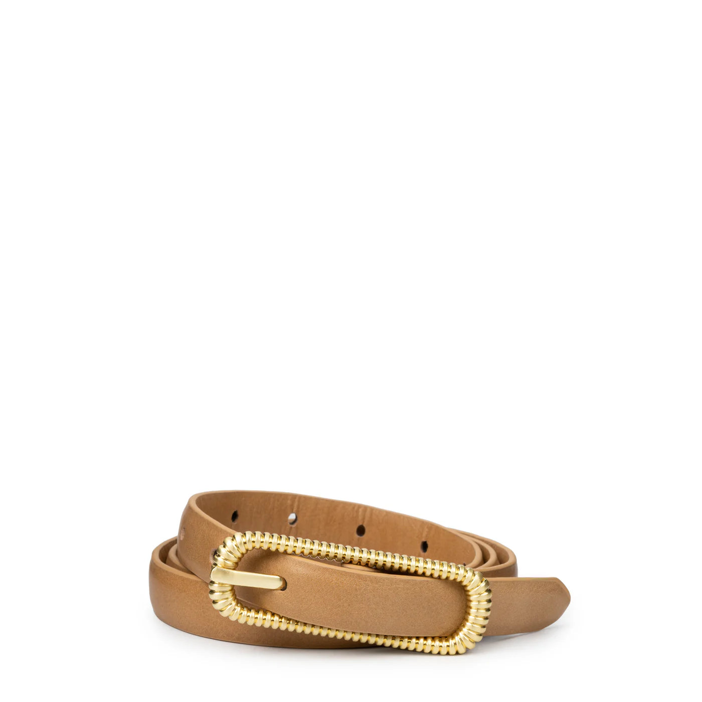 The Viseu belt will add a touch of sophistication to every outfit. The supple vegetable tanned leather is accentuated with an elongated, sculptural buckle with textured brushed gold that was custom designed in- house. Pair with your favourite jeans or tailored pants.