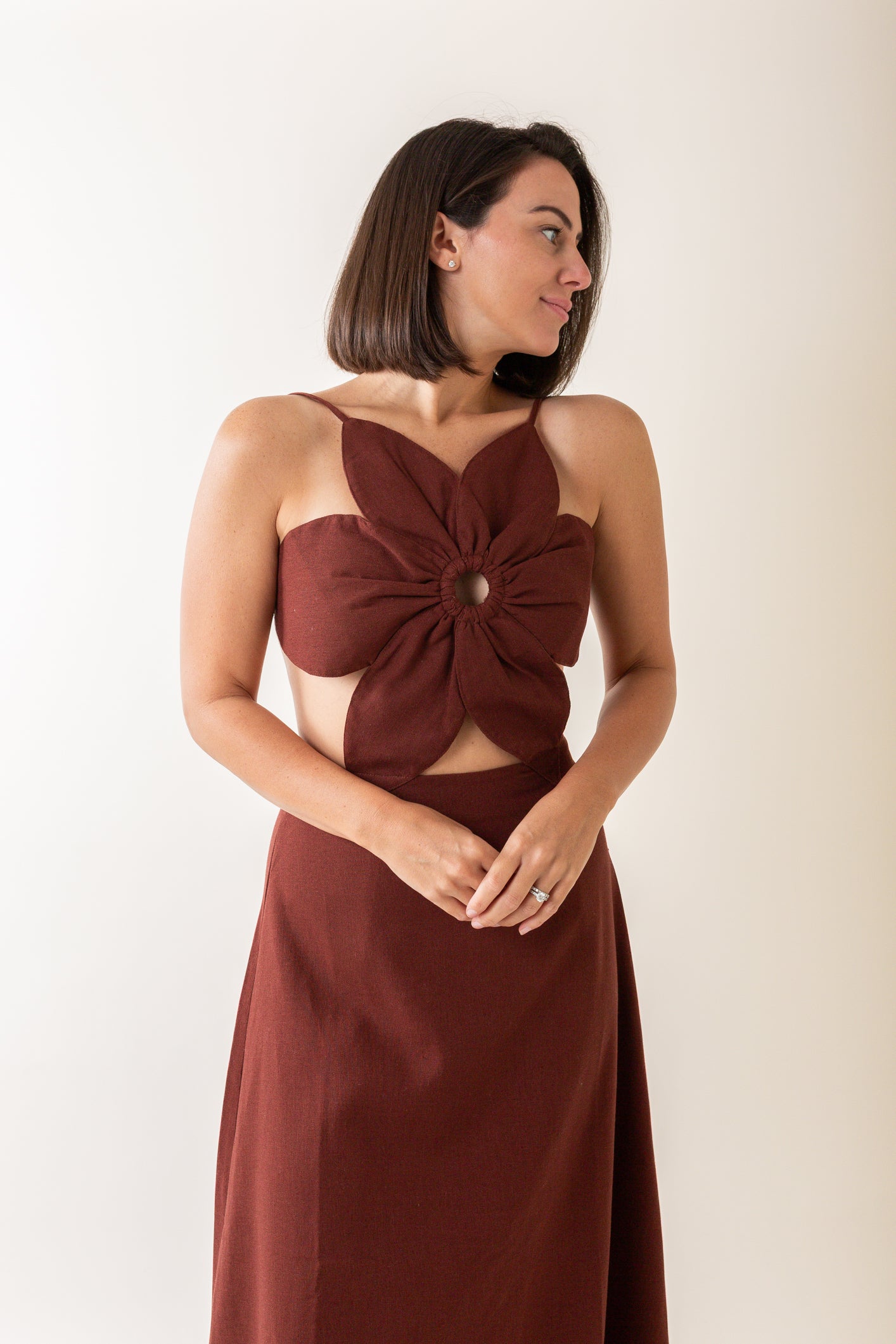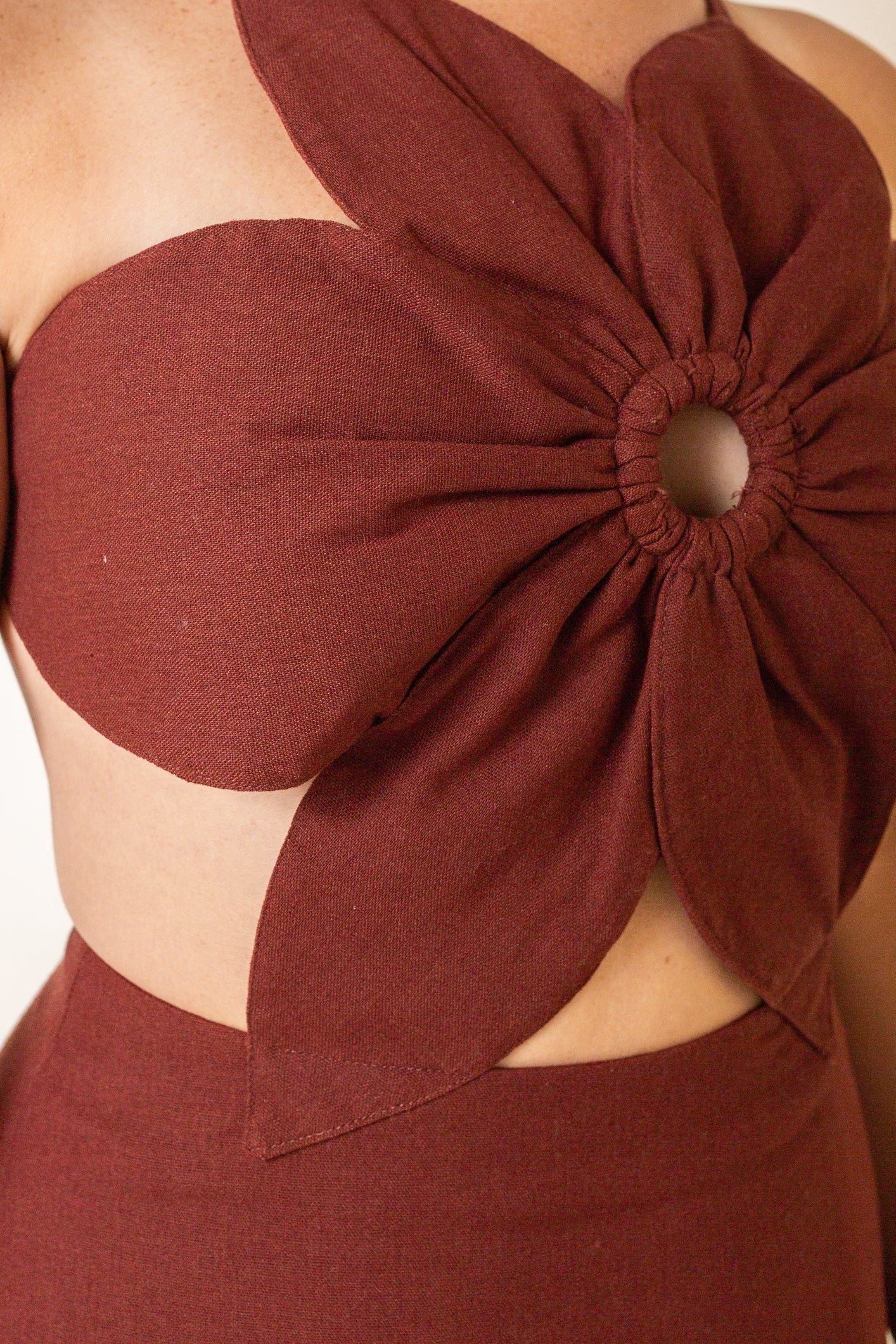 - Flower petal panels make up bodice, with center cutouts
