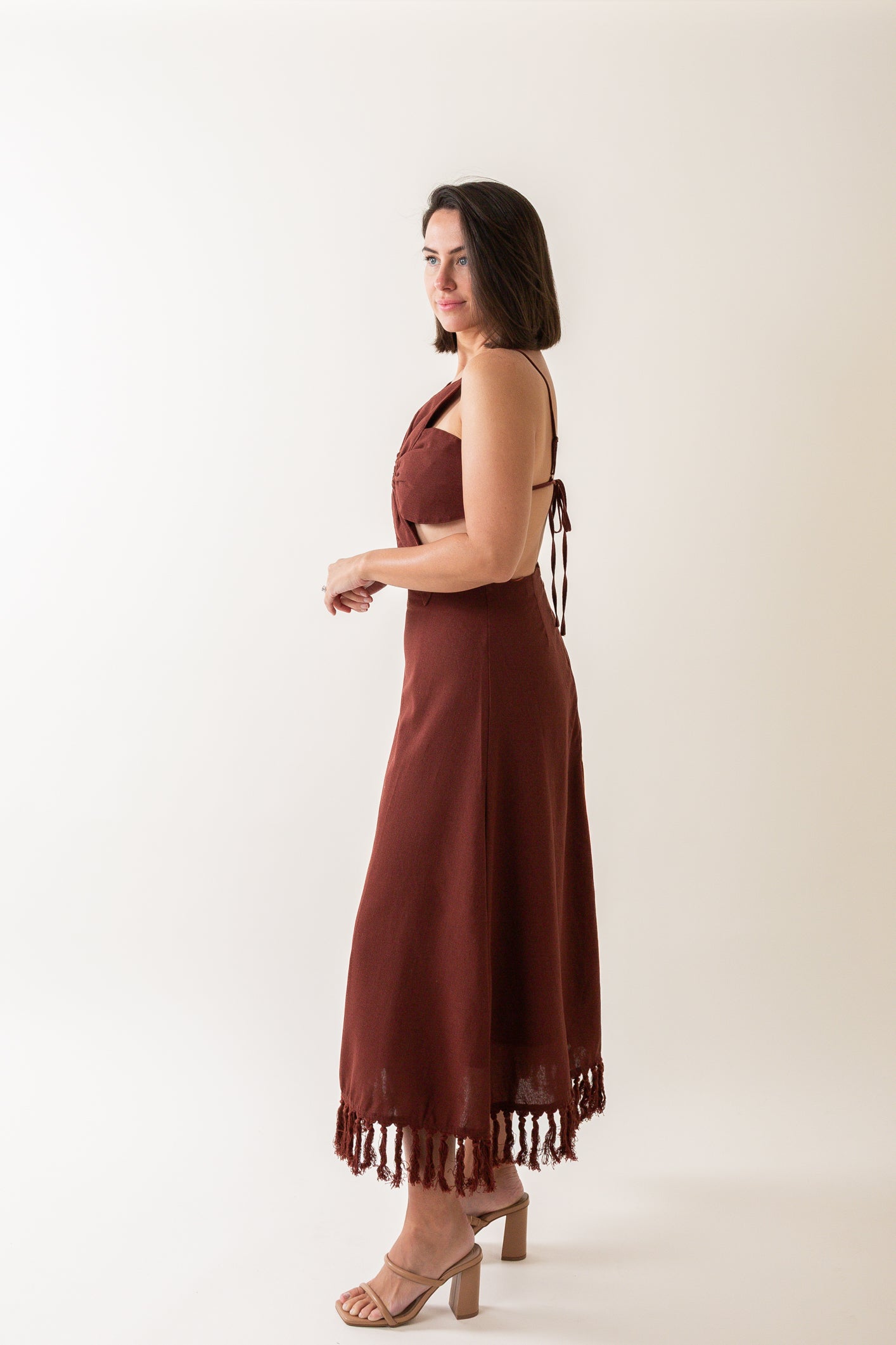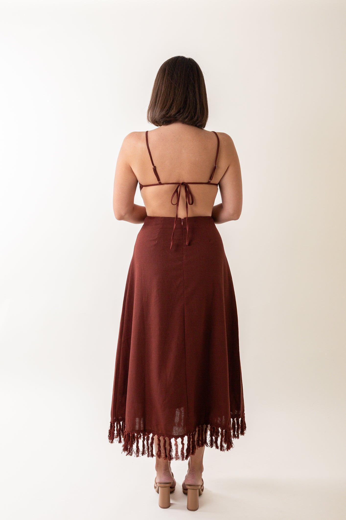 - Adjustable spaghetti straps that tie in the back