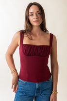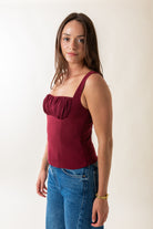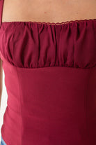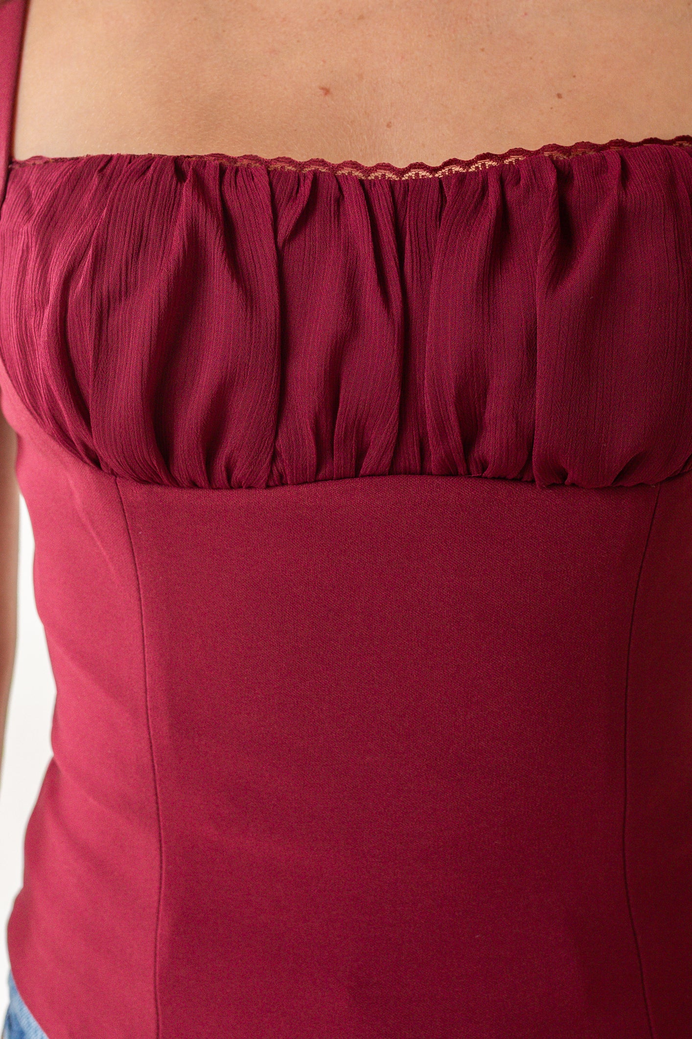 - Gathered bust with lace trim