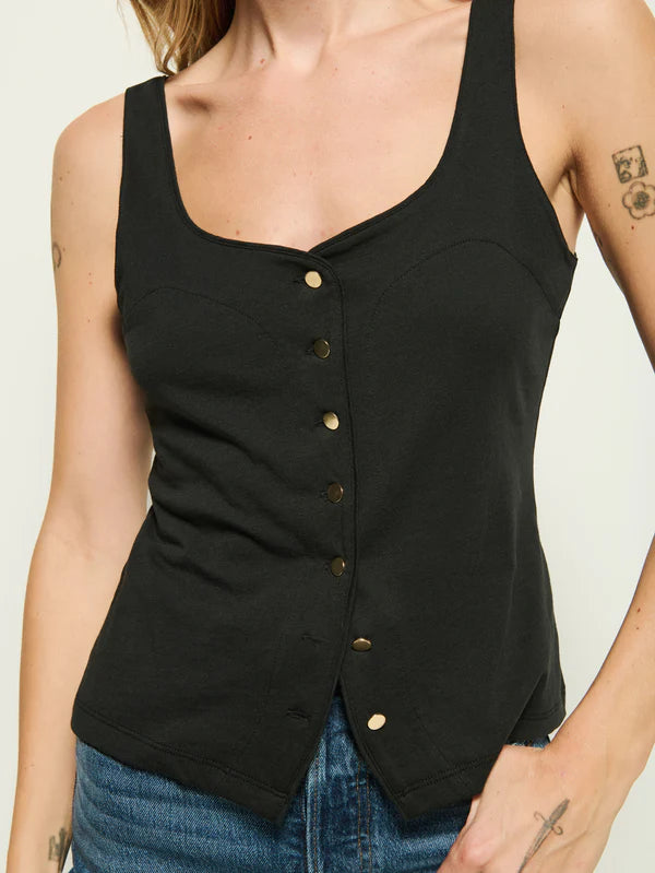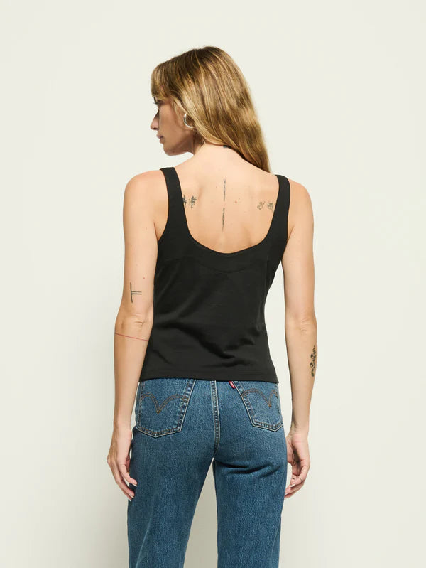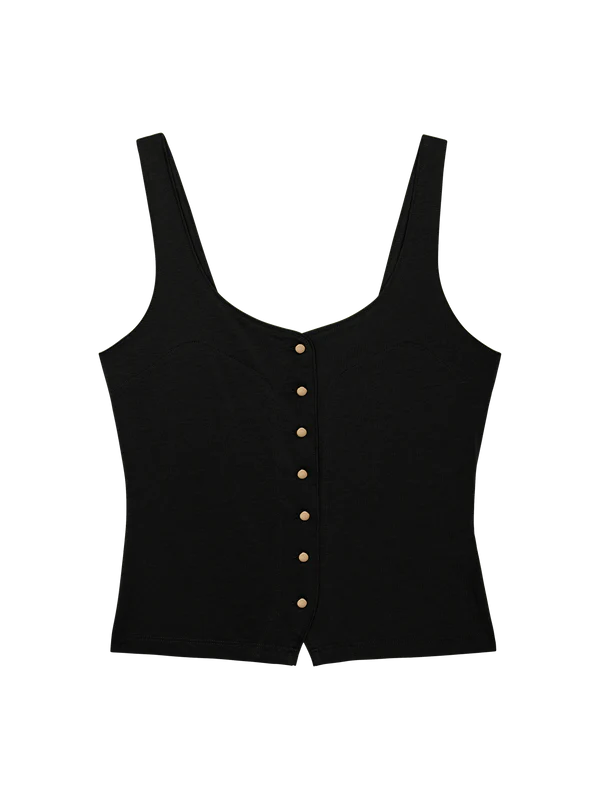 In a mindful organic cotton, the Brya Tank Top features a luxe fitted bodice with front stitch detailing, a bra-friendly scoop neckline and Nation's signature gold shank-button closure.