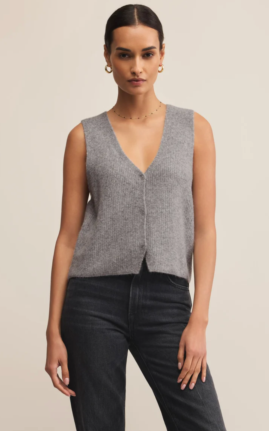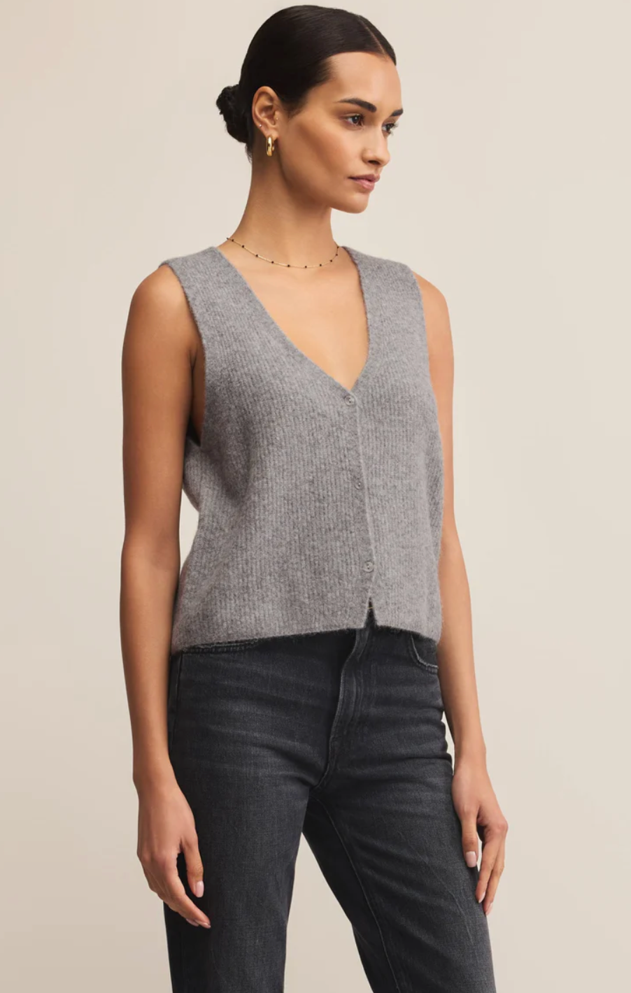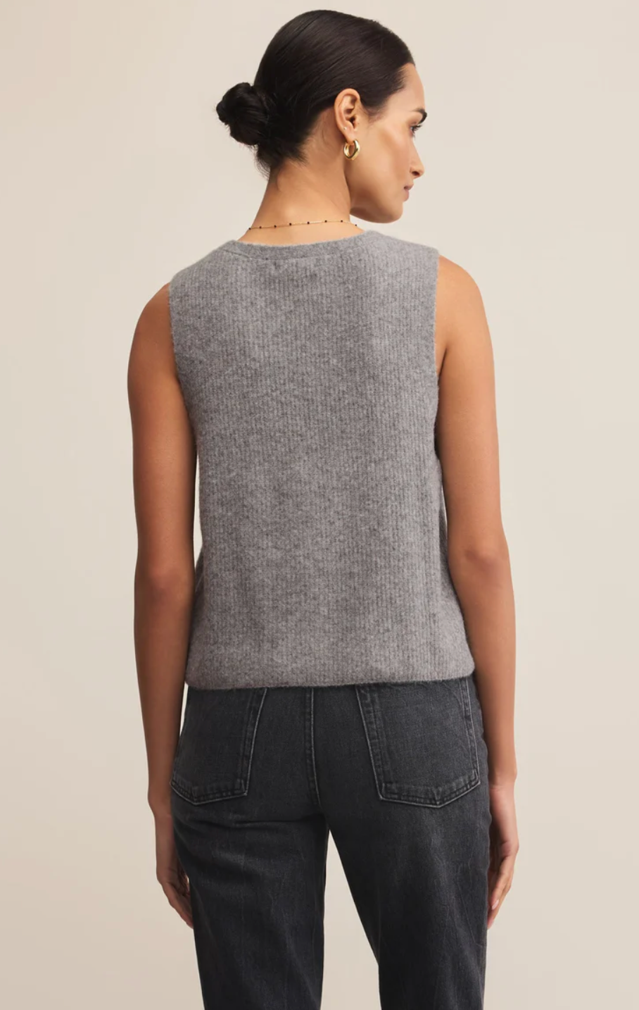 Designed in our soft Cozy Summer yarns, this sleeveless v-neck brings an airy weight and textured rib detailing. A standout piece that works solo in warm weather or layered as temps cool.