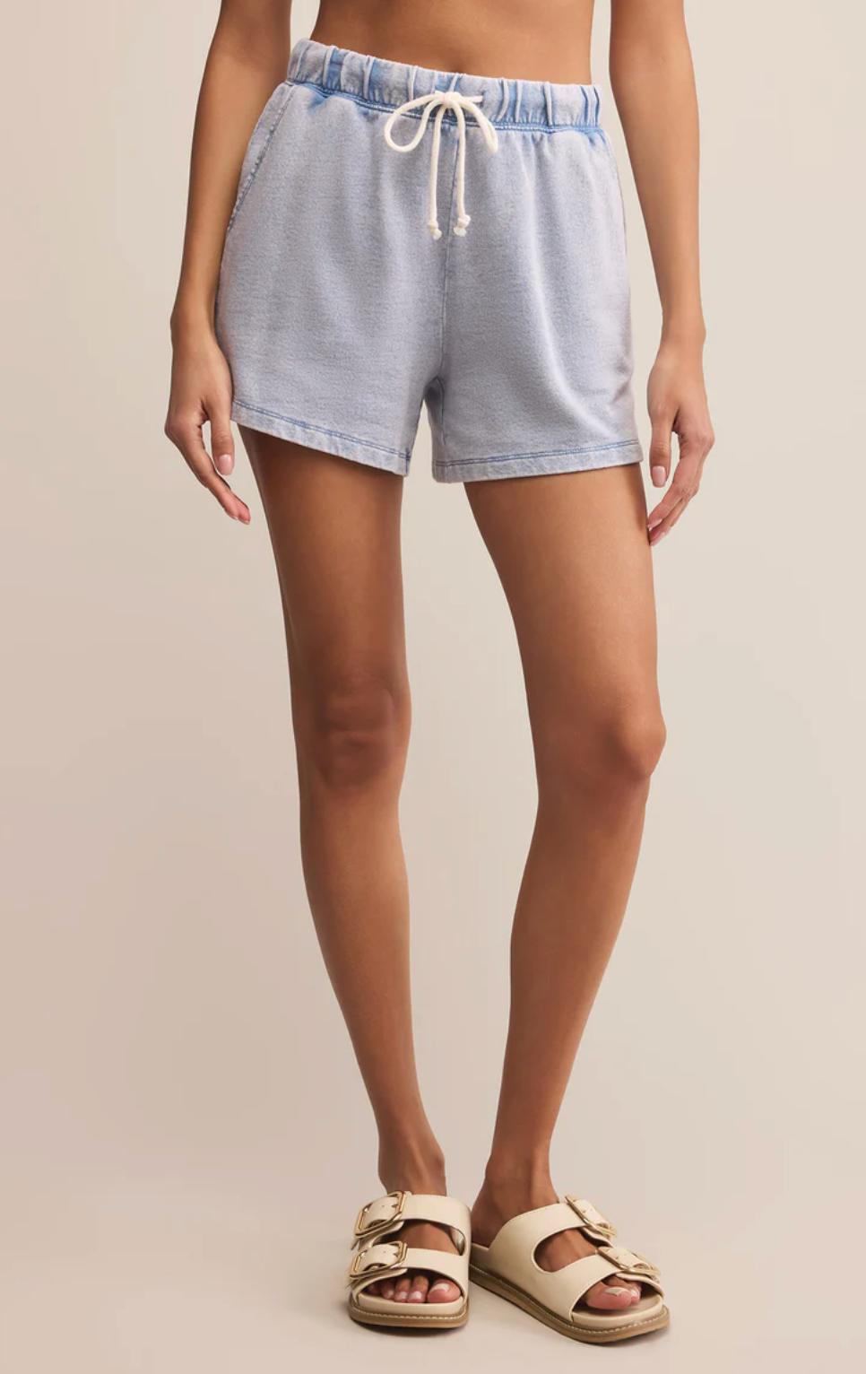 Kicked-back and cool, this knit denim French terry short has a lived-in look and feel. The contrast drawcord at the high-rise waist gives a little sporty twist, while the slash pockets keep it functional.