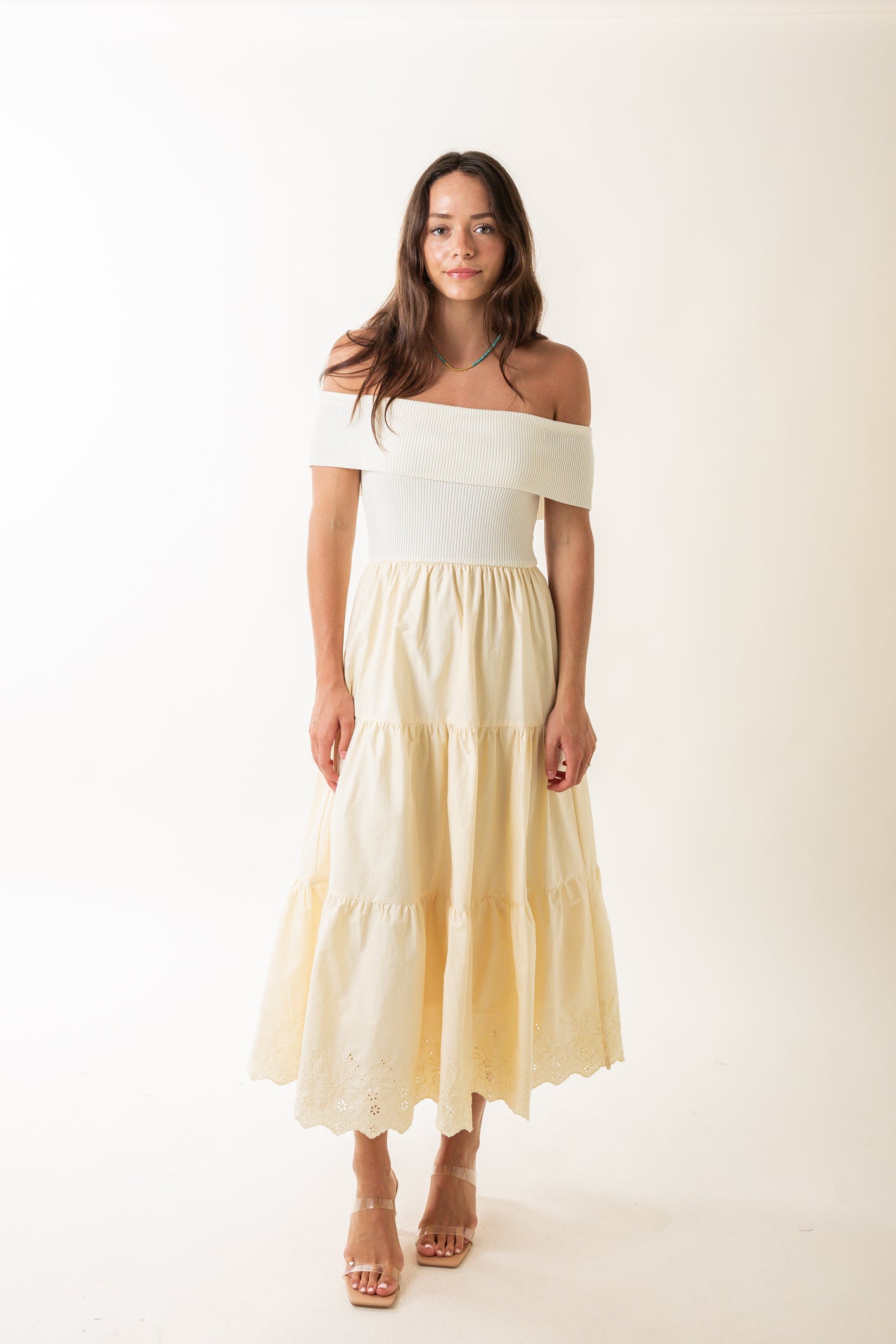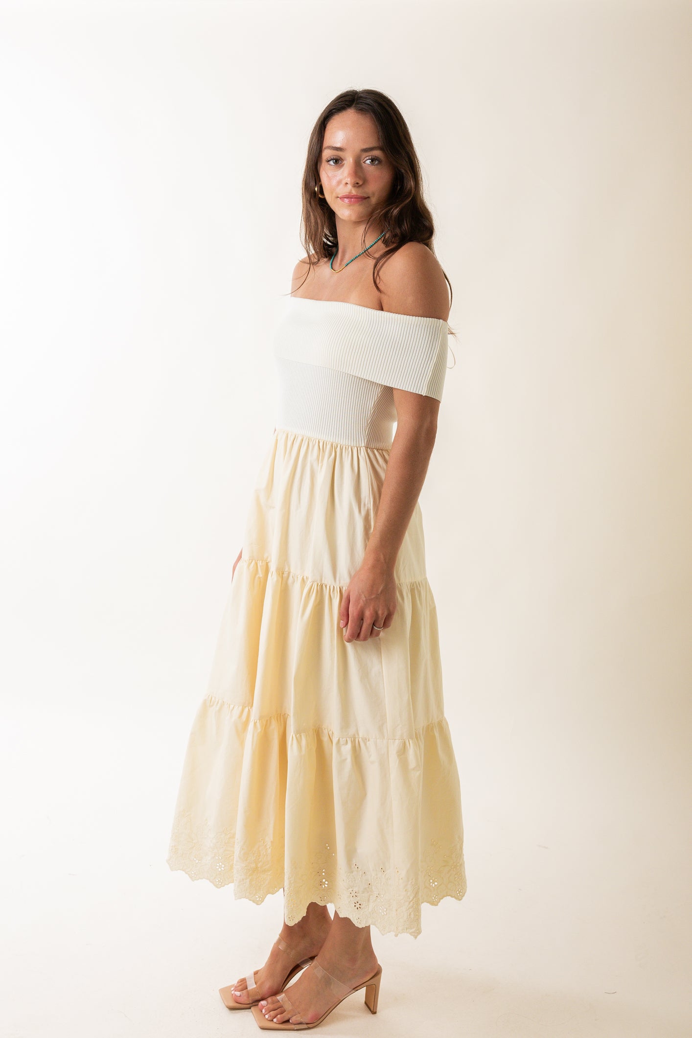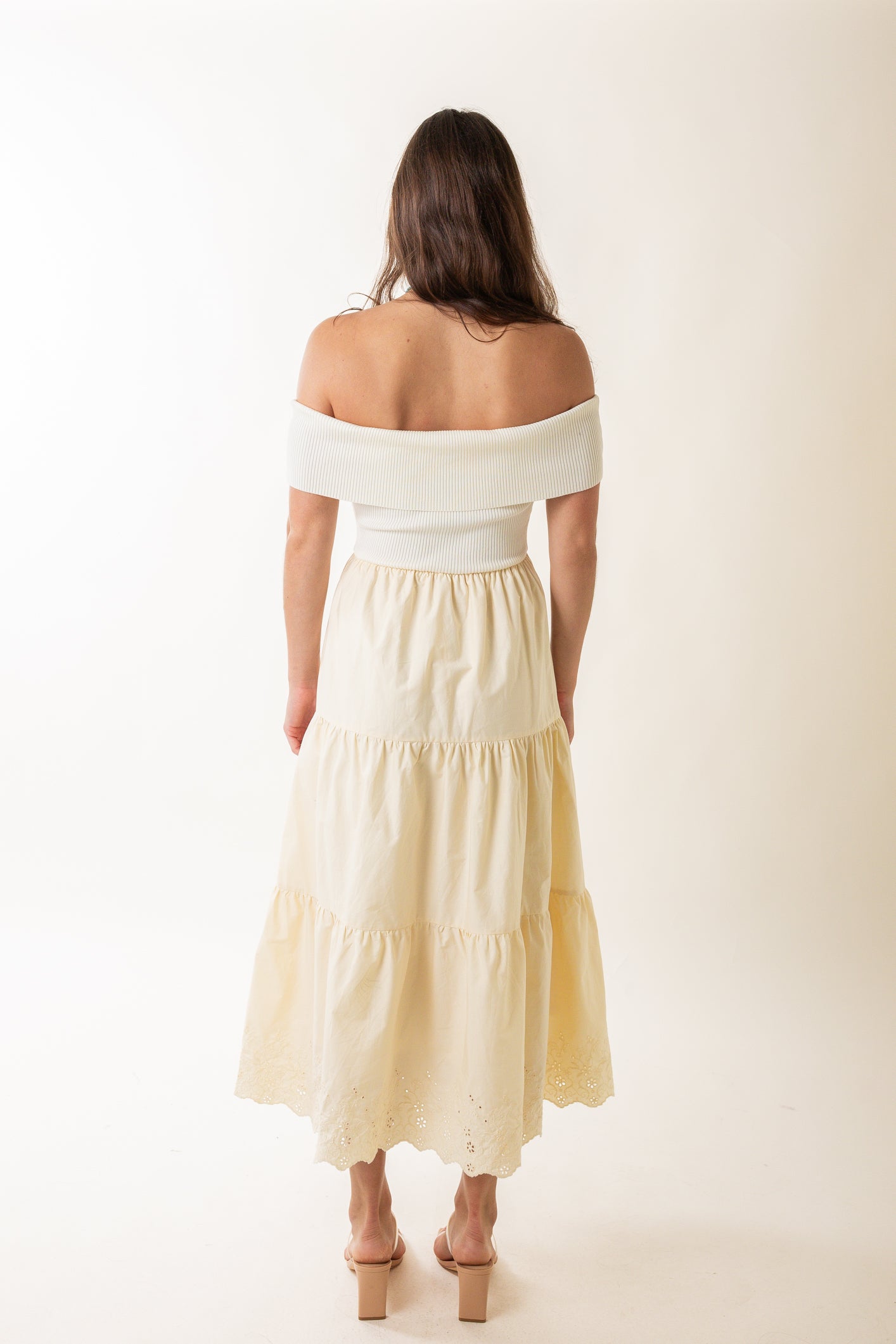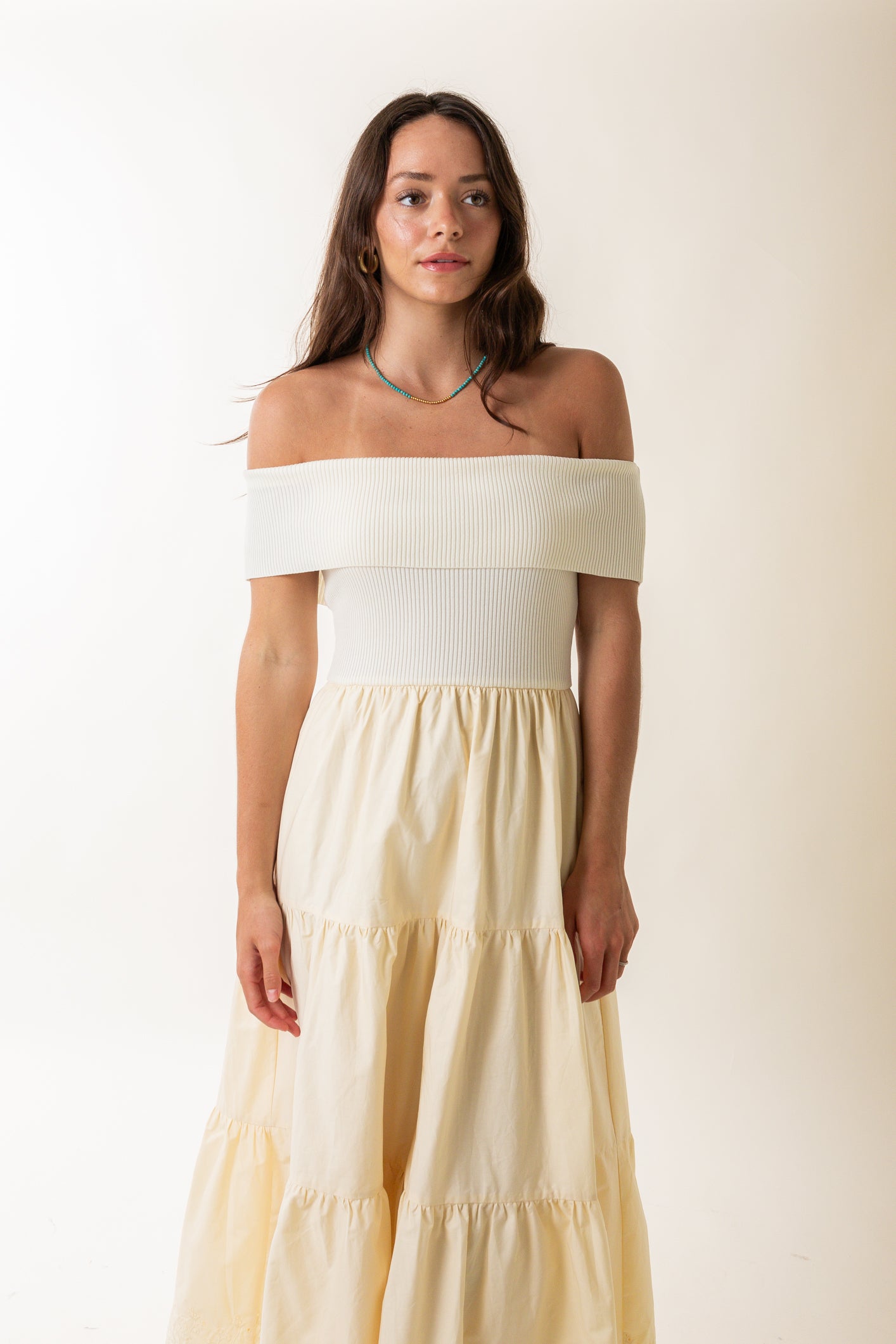 Off the Shoulder Tiered Midi Dress in Cream
