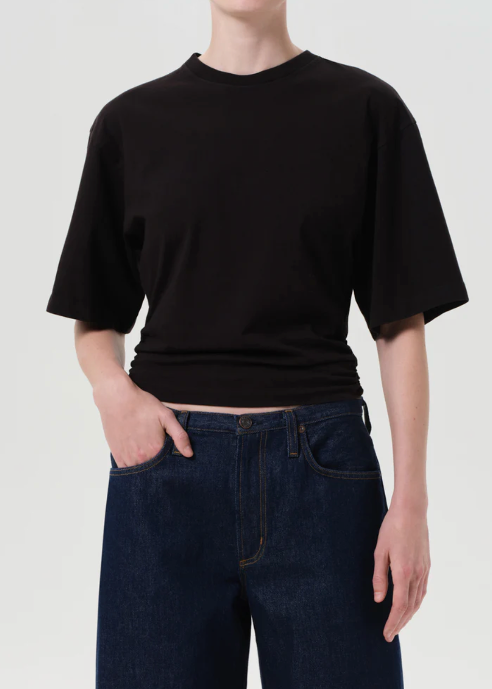 A fresh take on the classic white tee. The Shari is cut from lightweight cotton jersey with exaggerated short sleeves and a slightly cropped fit.