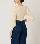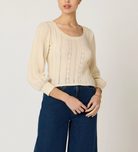 The Zoe Sweater is ethically crafted from 100% certified organic cotton yarn and poplin, blending comfort with refined detail. This 3/4 sleeve pointelle knit top features structured cuffs and a delicate scalloped hem, offering a feminine touch to a breathable, everyday silhouette.