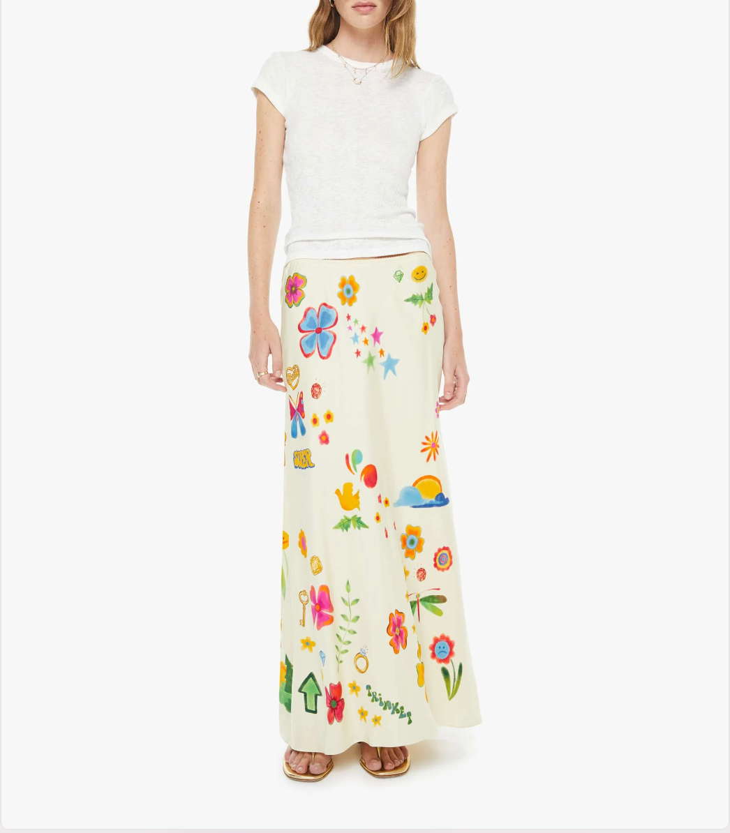 Flower power. A maxi slip skirt with a mid rise, loose fit and an ankle-length hem. Made from 100% cupro in off-white, Mystical Garden features colorful flowers, stars, butterflies, leaves and more throughout.