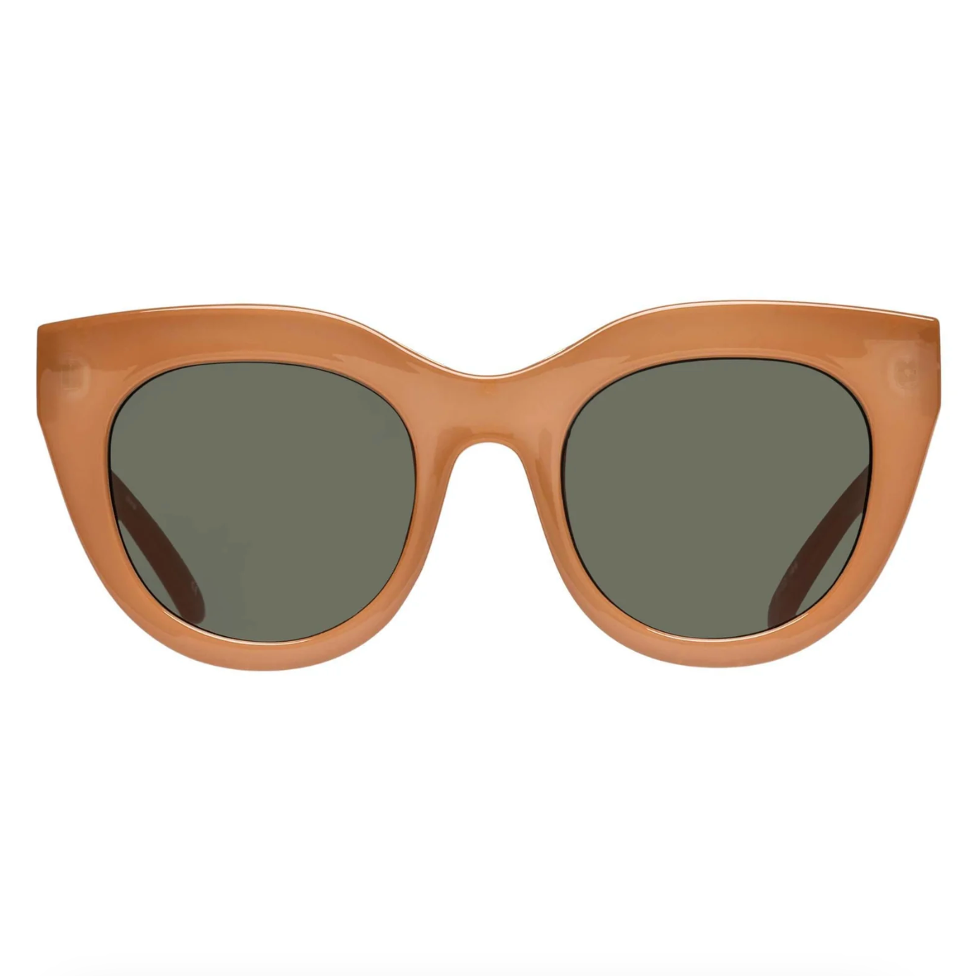 A favourite of Meghan Markle and Olivia Palermo, the Air Heart silhouette is an iconic Le Specs style. With oversized and dramatic proportions reminiscent of a cat eye, the style is designed with a thick caramel frame and luxurious metal top bar inlay, then fitted with premium zero base khaki grad flat lenses.
