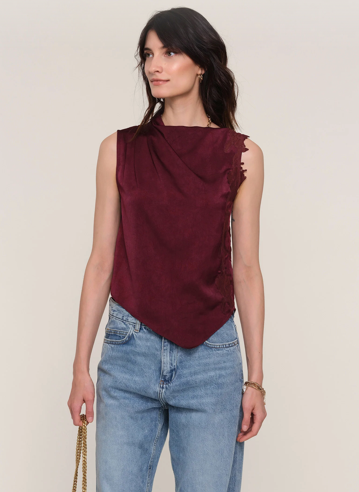 The Novia Top is made from a luxe, hammered satin. It has a draped shoulder that falls into an asymmetric hem. It features a pretty lace at the left side.