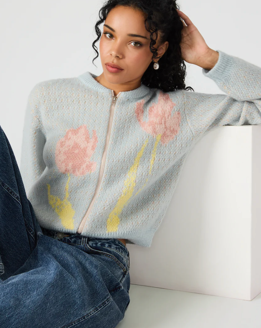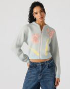 The Jena Sweater Jacket combines versatile layering with distinctive style. This long-sleeved zip-up design features an eye-catching floral pattern that adds visual interest to any outfit. The sweater jacket construction offers the comfort of a cozy knit with the structured appeal of a jacket, making it ideal for transitional seasons or layering over basics. The full-zip front allows for easy styling adjustments throughout the day, whether worn open as a statement layer or zipped for warmth. Perfect for elevating casual ensembles with a touch of botanical-inspired sophistication.