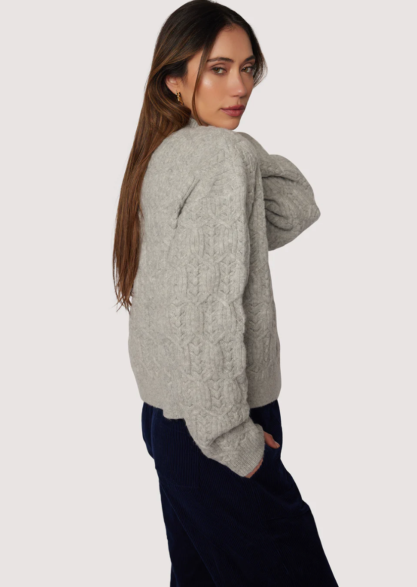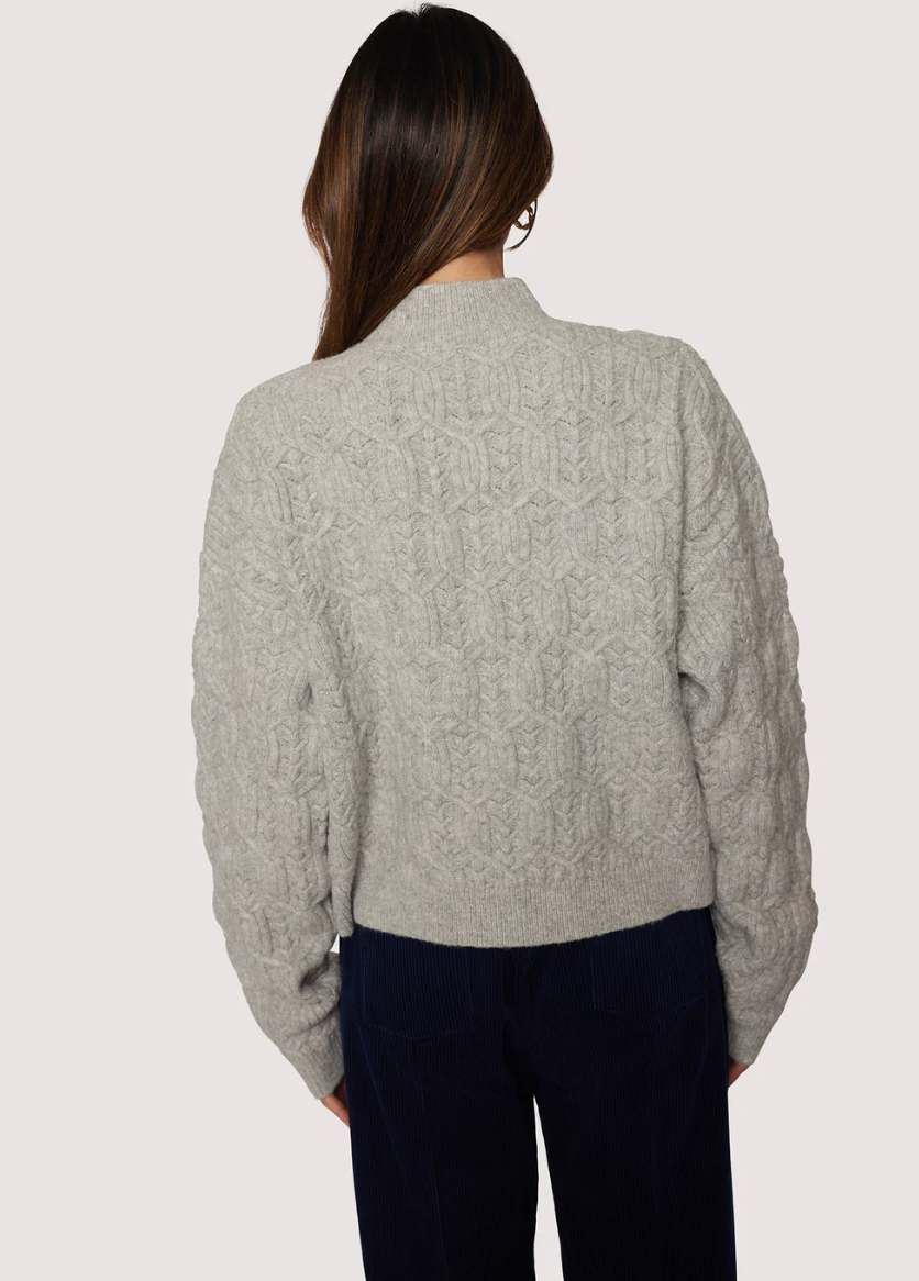 The Viola Pullover is a cable knit mock neck sweater in a classic grey shade, designed to carry you seamlessly from fall into winter. Its rich texture and refined fit provide both warmth and sophistication, making it a timeless addition to your wardrobe. Perfect for layering or wearing on its own, this sweater combines comfort with understated elegance for a polished seasonal look.