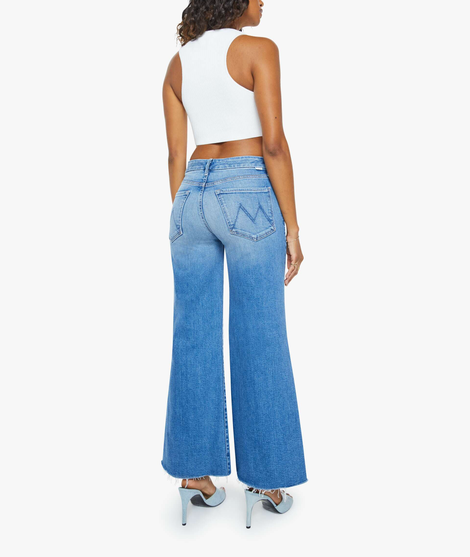 Crowd pleaser. This iconic high-waisted wide leg has a 31-inch inseam and a frayed hem. Cut from stretch denim, Fan Favorite is a mid-blue with whiskering and fading at the knee.