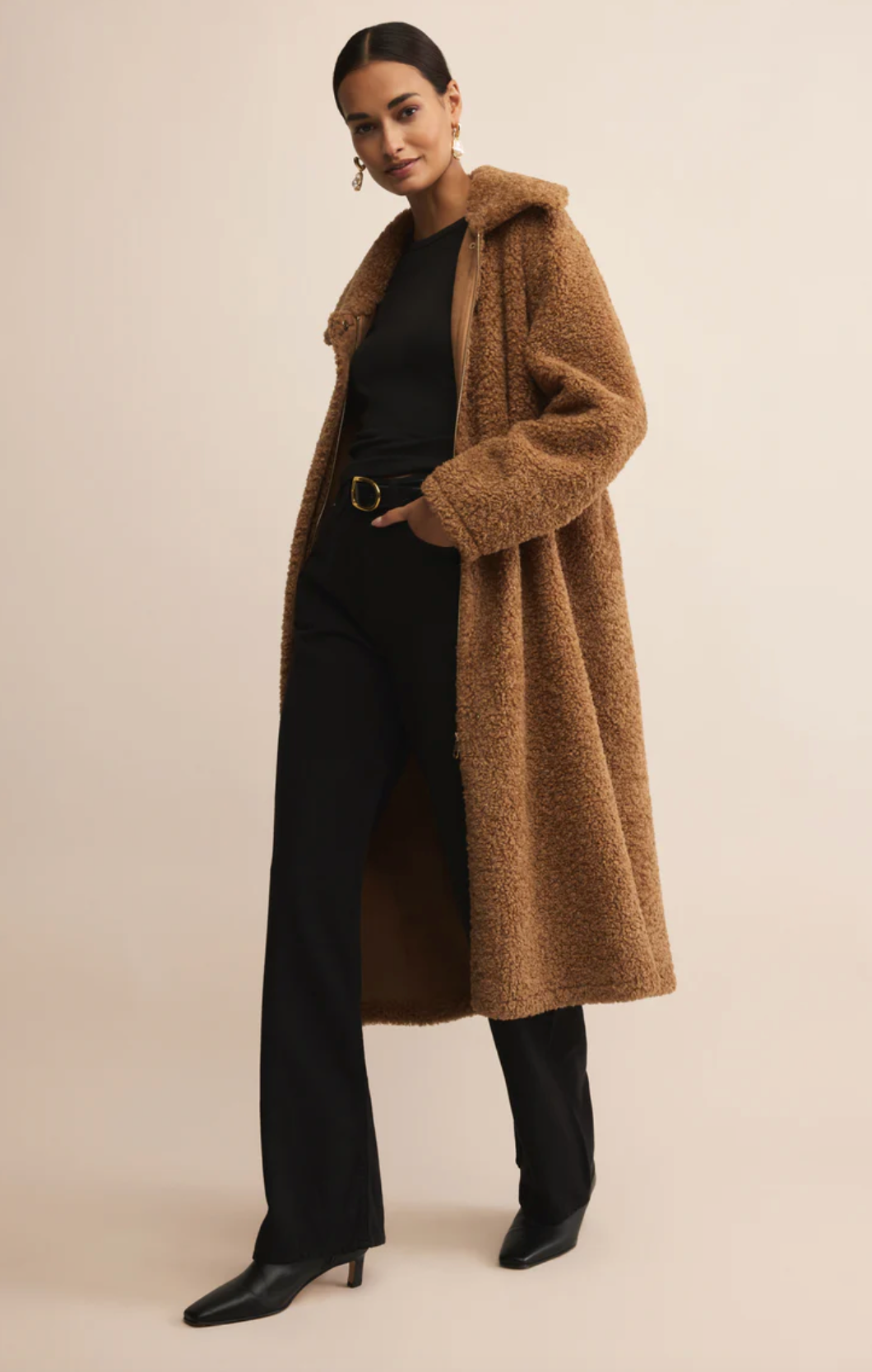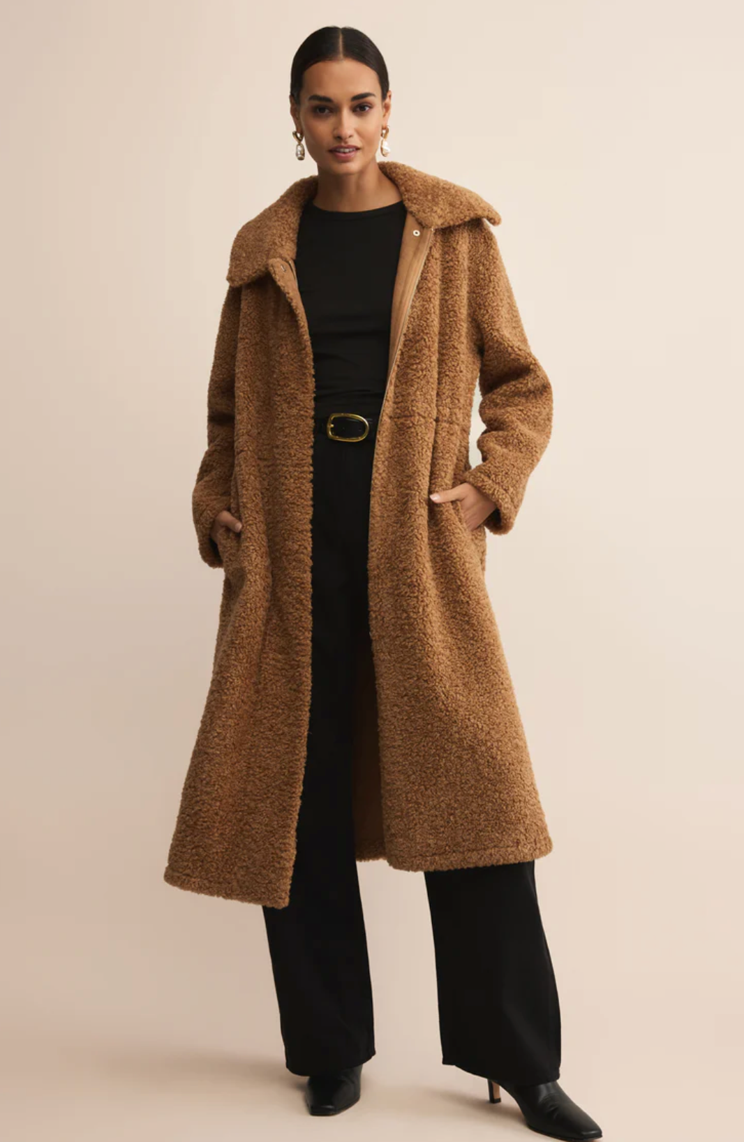 Soft sherpa outside gives this zip-front coat its plush feel, while faux suede lining keeps the look elevated. An adjustable interior drawcord lets you cinch the waist or leave it relaxed for layering, with side pockets and a snap placket for added function.