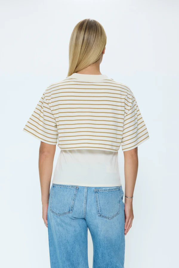 Camryn pairs a cropped, boxy tee with a full-length bottom layer, creating a two-tier silhouette with minimal effort. The soft shape combines structure with comfort while the Tannin Ecru stripe atop the solid base layer adds subtle depth to this everyday staple.