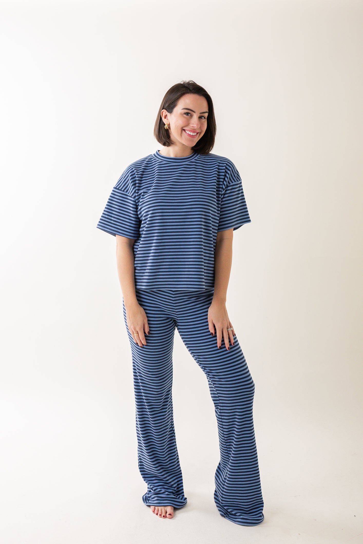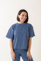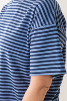 Fleece tee, Stripe light blue, navy blue, crew neck