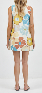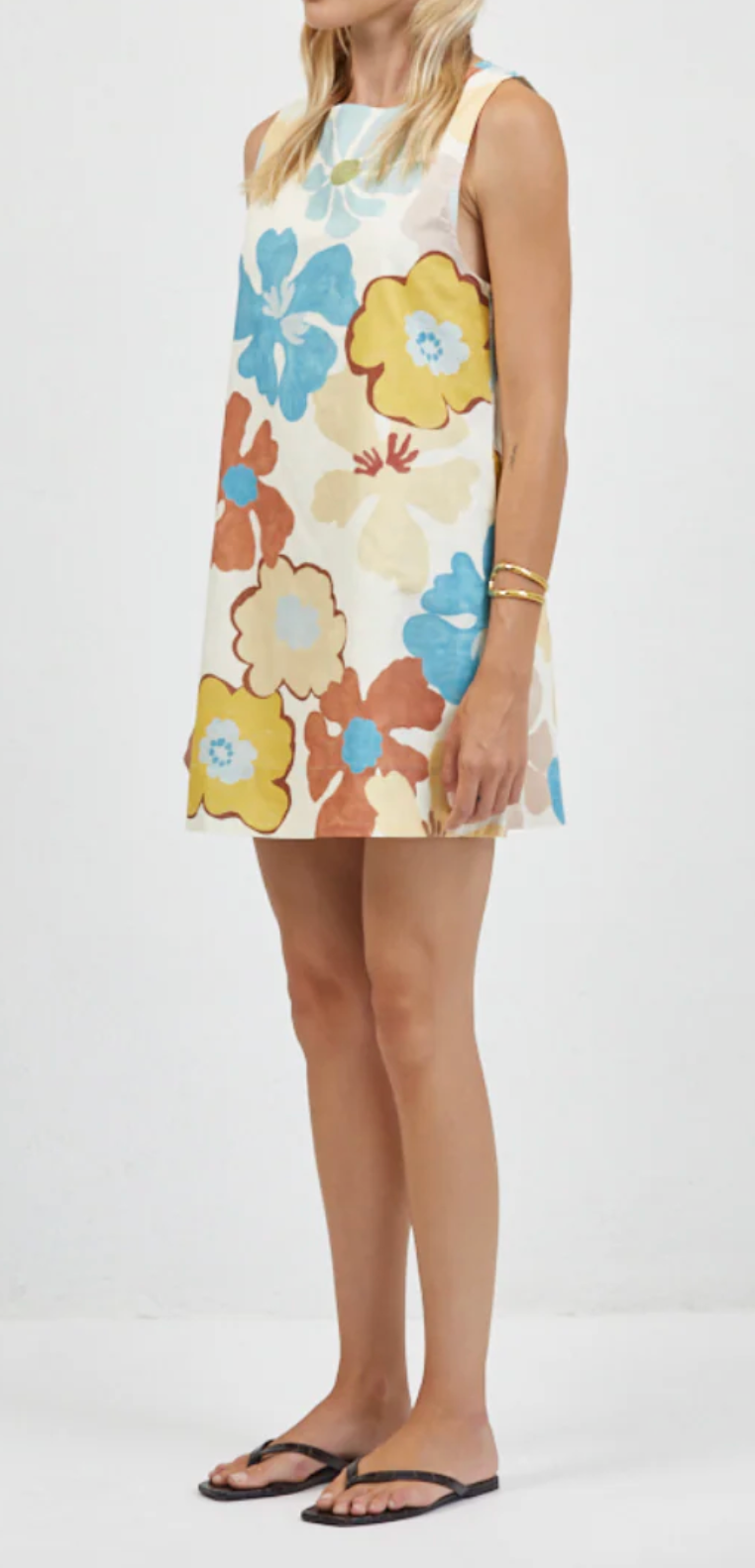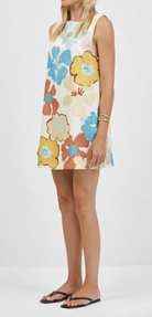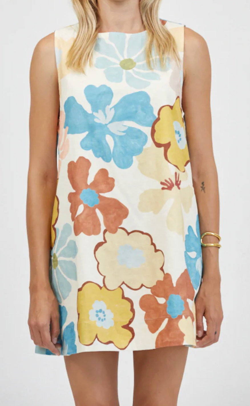 Sleeveless mini shift dress in a linen blend fabrication with button back closure. 32" length.