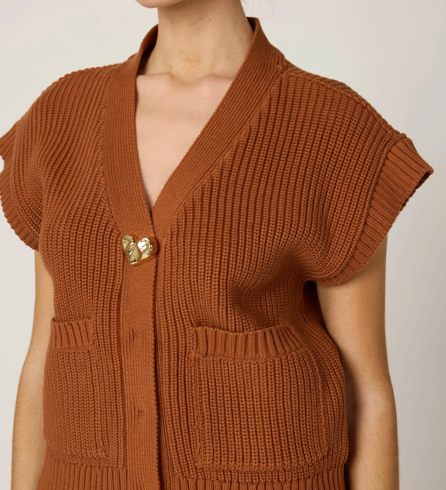 Crafted from 100% organic cotton yarn, the Cuore Sweater Vest is a timeless layering piece designed for effortless sophistication. This sustainable knit vest features a relaxed drop-sleeve silhouette, functional pockets, and a gold heart button accent. At its center, an imperfect heart detail adds a unique, one-of-a-kind touch that reflects Cleobella’s artisanal craftsmanship. Perfect for layering over your favorite Cleobella dress or pairing with our core organic cotton bottoms, the Cuore Sweater Vest brings warmth, texture, and elevated charm to any look.