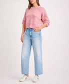 Chunky-knit sweater with a round neckline and long balloon sleeves. Features subtle open-knit stripe detailing that adds texture and visual interest. Made from a soft cotton-blend knit for a comfortable, breathable fit.