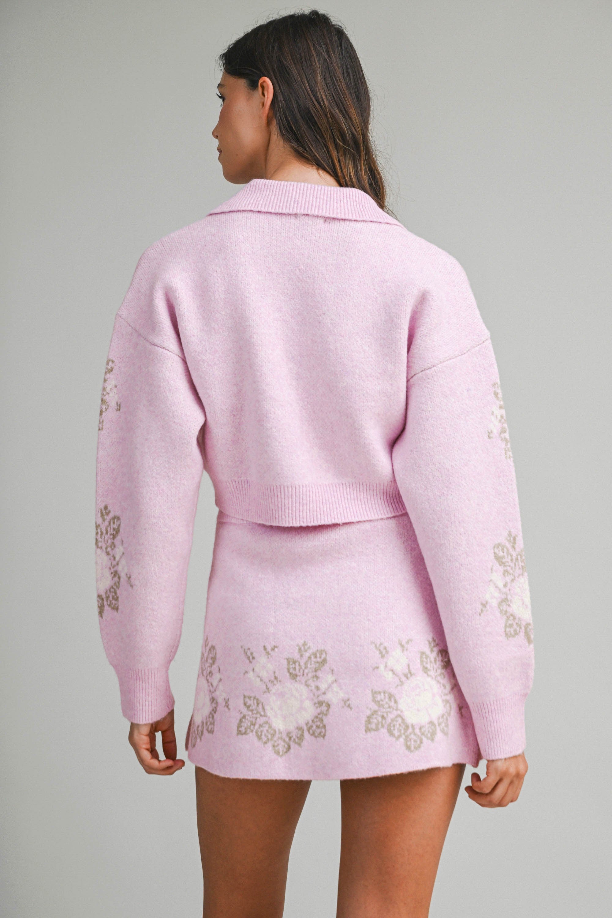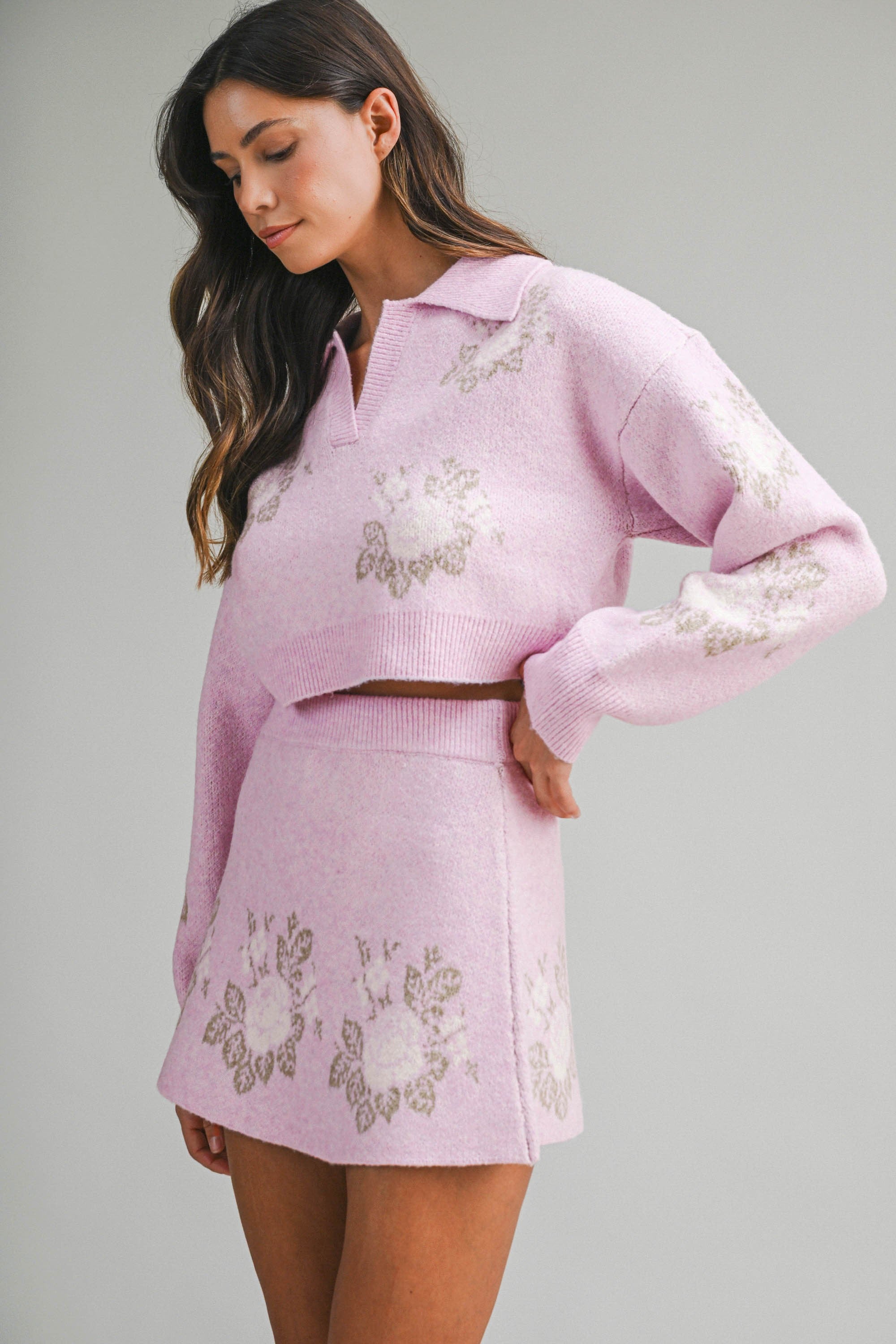 Sweater knit set with floral jacquard pattern. Cropped collared sweater with long sleeves and matching high-waisted mini skirt.