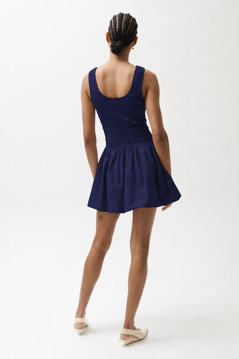Ilona features a fitted bodice that flows into a softly structured bubble hem. Designed to hold its shape while moving with ease, its clean lines and subtle volume create an elevated yet effortless look in a rich blue hue that transitions seamlessly from day to night.