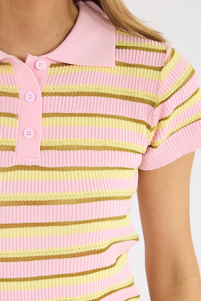 The Levanzo Knit Polo is a striped, ribbed knit top featuring a vibrant, multi-toned design with a classic collar, button-front closure, and short sleeves. This soft, stretchy, and versatile top is ideal for casual or elevated styling, pairing well with denim or trousers.