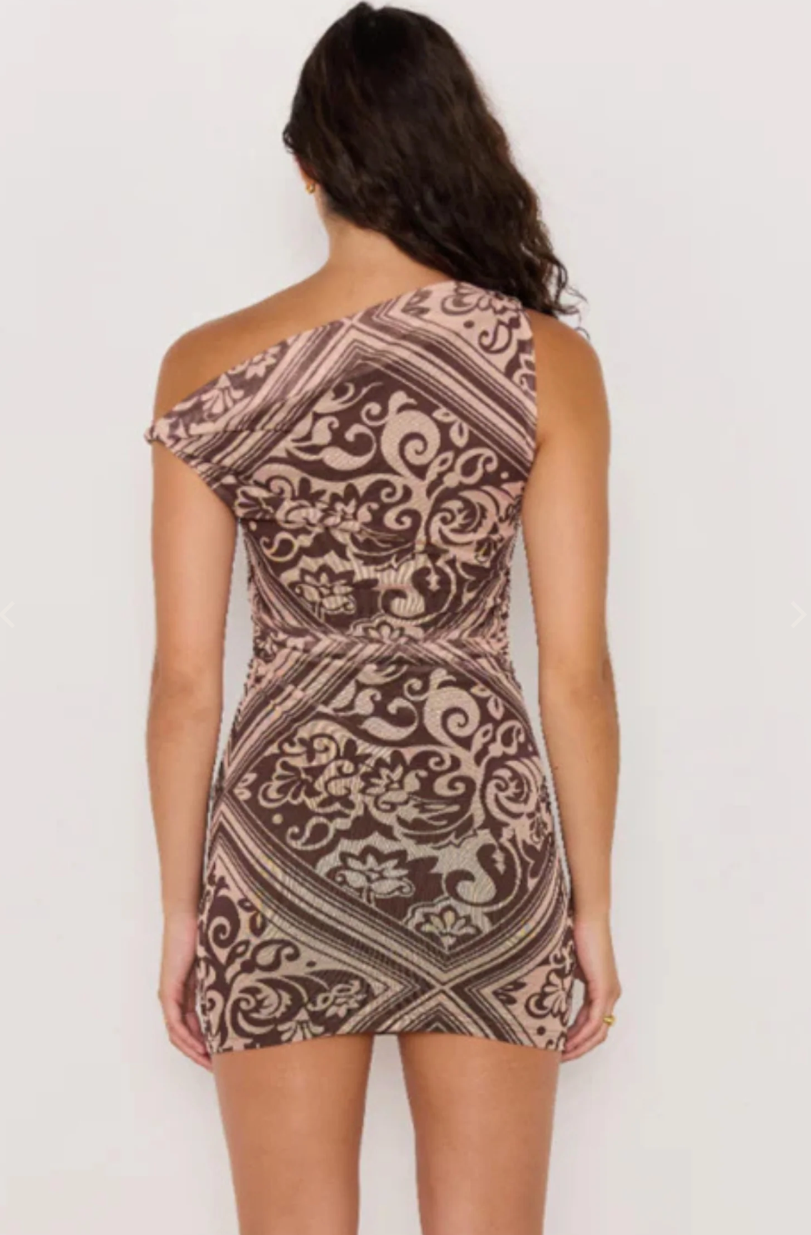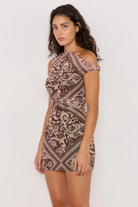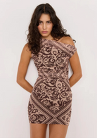 The Lumi Mesh Mini Dress makes an entrance. Designed in a statement baroque-style print, this body-hugging silhouette features side ruching and a soft mesh overlay. Fully lined for comfort, it's the perfect mix of bold and elegant.