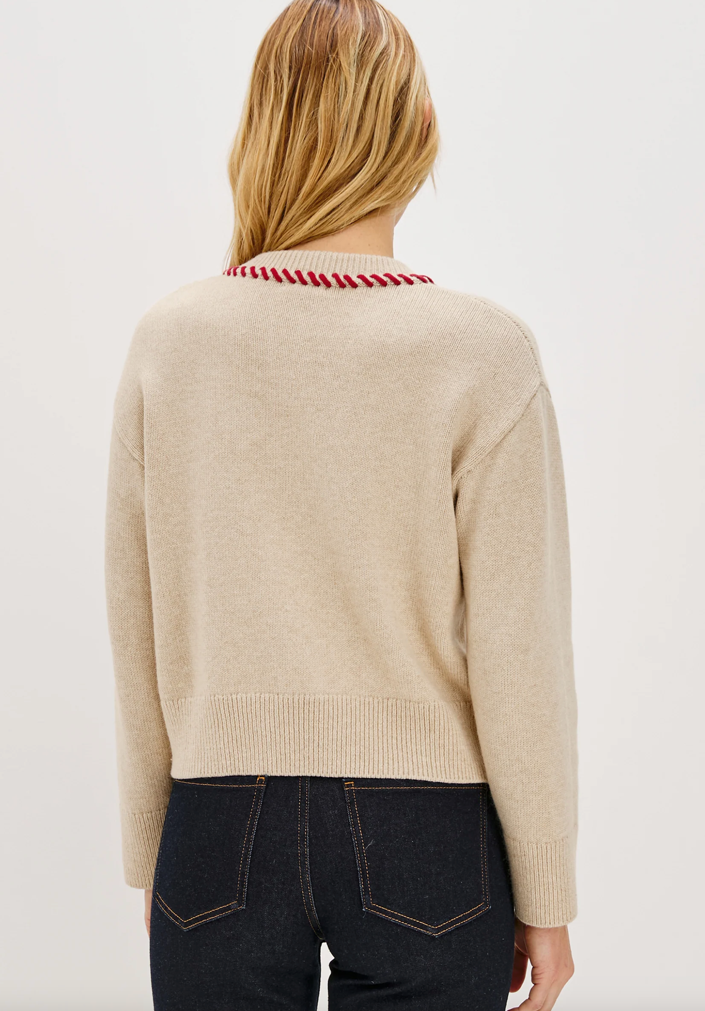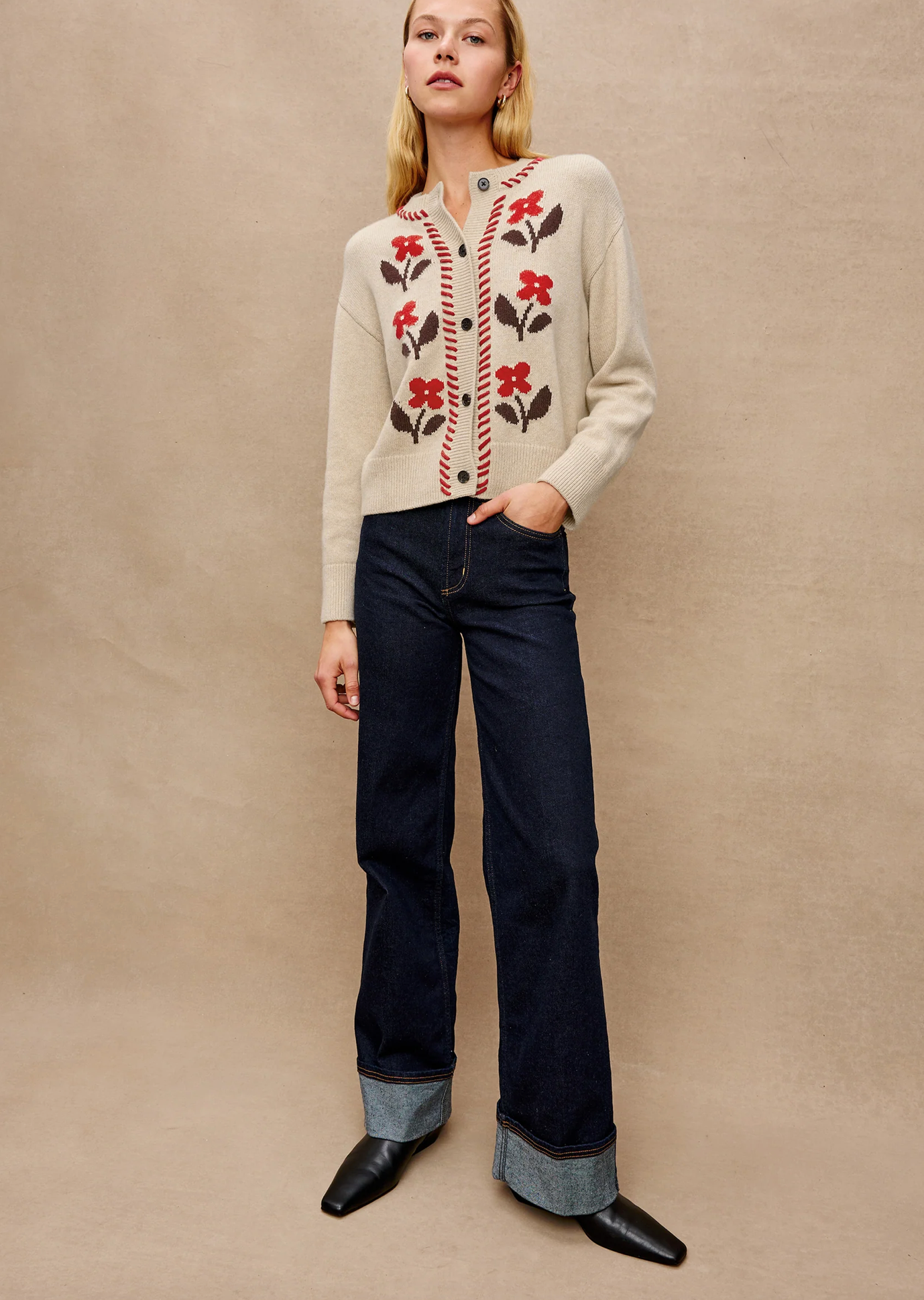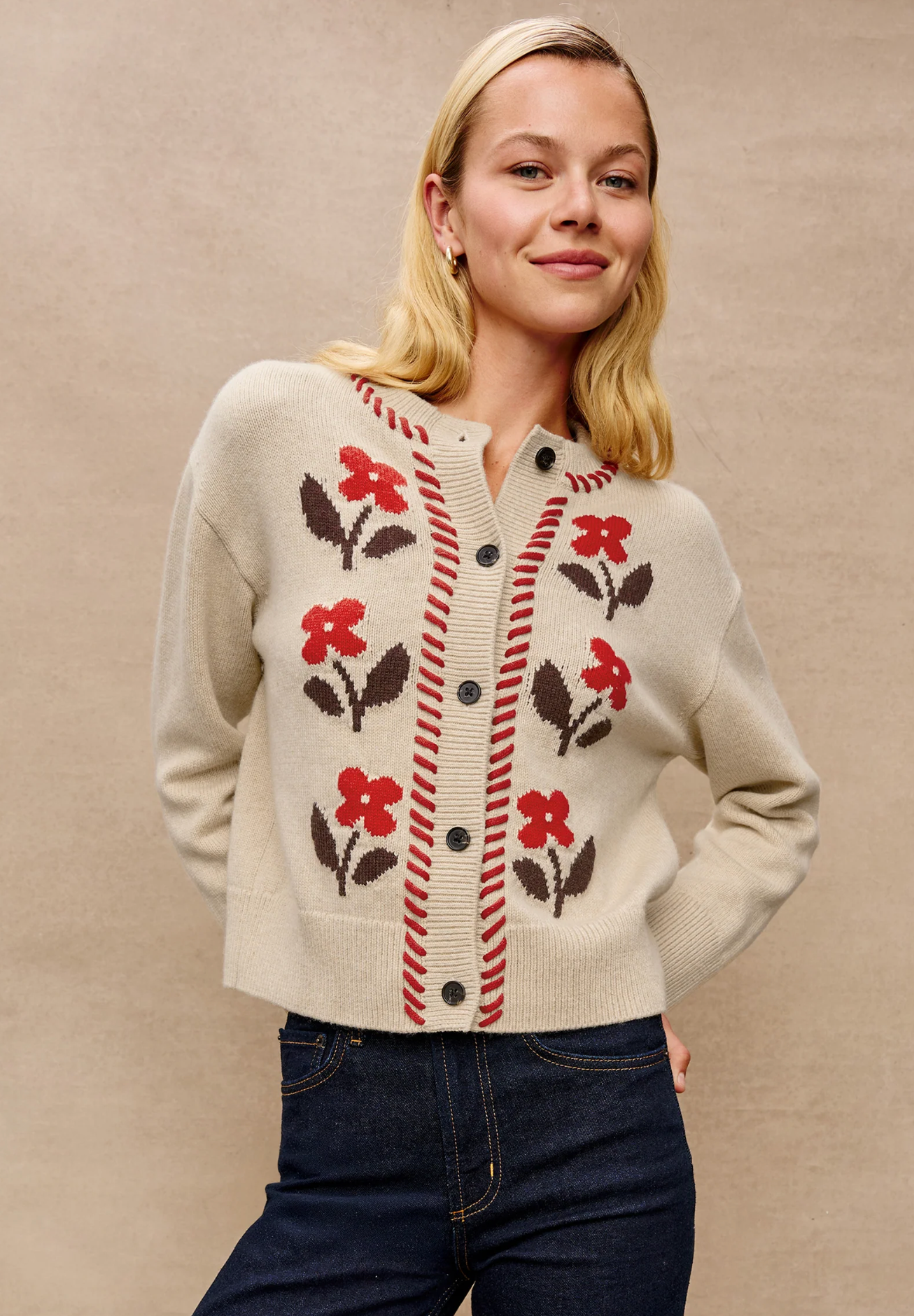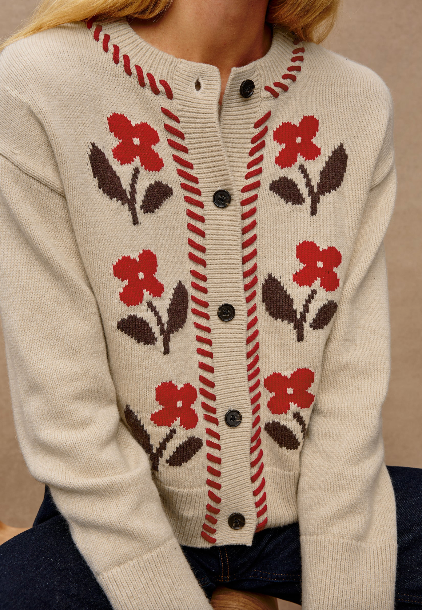 The Mavie is a heritage-inspired cardigan crafted from a cozy wool blend with a boxy-cropped fit. Blanket stitching and jacquard florals add a nostalgic touch.