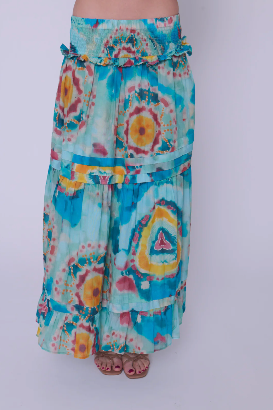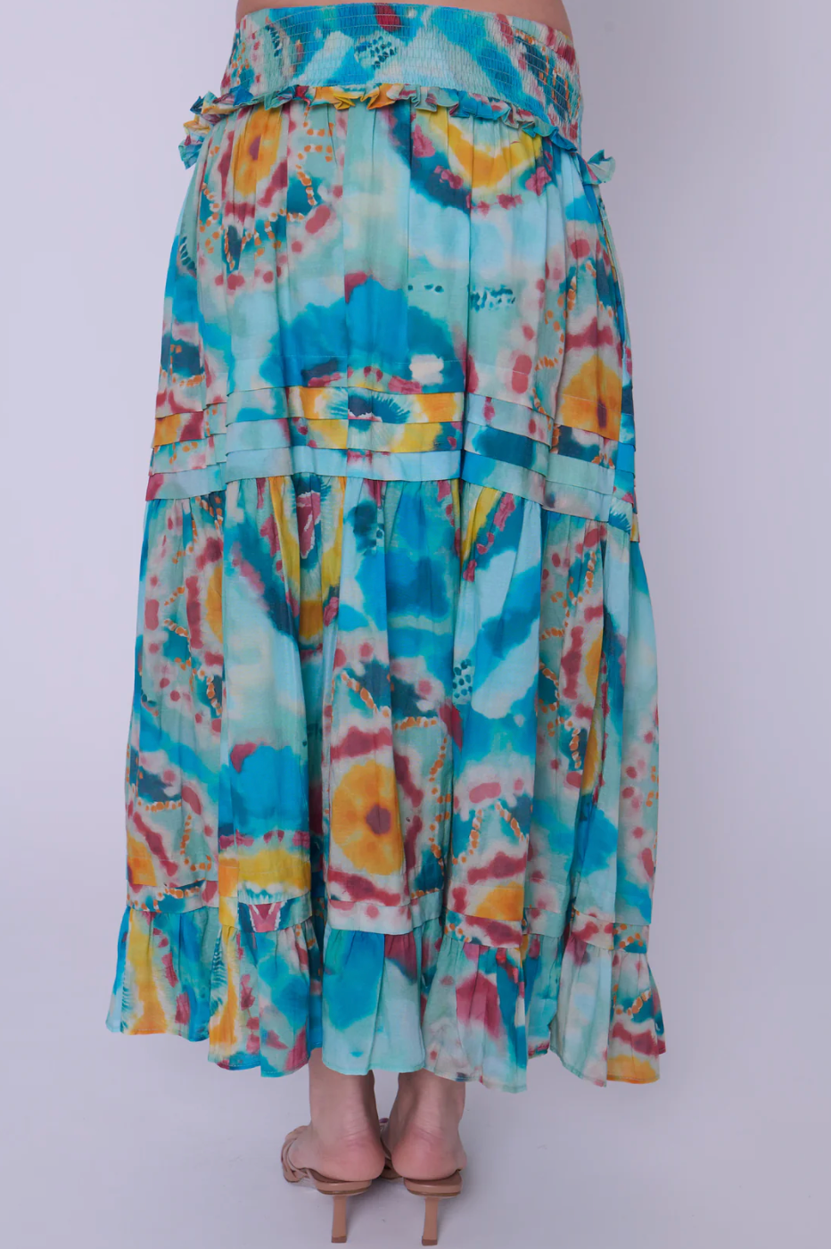 Twirl-worthy and timeless! The Midi length Nolan skirt is easy to slip on with a smocked waist, and soft pintuck pleat details throughout the skirt. Now featured in Love the Label’s vibrant tie dye print, perfect for summer.