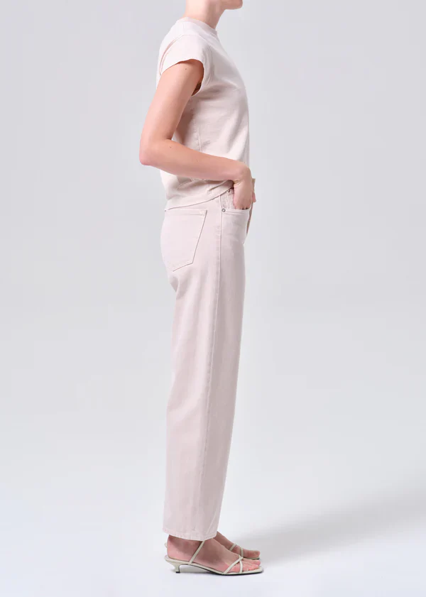 A high-rise wide-leg silhouette, the Ren Jean is designed with a flattering high waist, a relaxed fit through the hips, and a clean, elongated leg shape. Rendered in a light pastel pink wash, it brings a fresh, softly saturated twist to a timeless classic. Crafted from rigid non stretch regenerative cotton denim with a soft hand feel, it offers all day wearability while maintaining its sculpted structure.