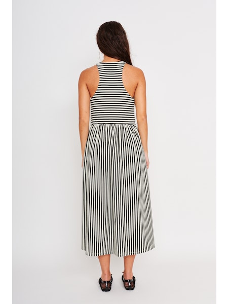 The Renzo muscle tank dress, crafted from a chic Navy/Taupe striped knit, is your go-to one-piece essential for effortless style. This midi-length dress features convenient inseam pockets and a flattering round neckline, embodying a fit-and-flare silhouette that promises both comfort and elegance. Perfect for spring, this dress combines practicality with a timeless look, making it an ideal choice for any casual outing.