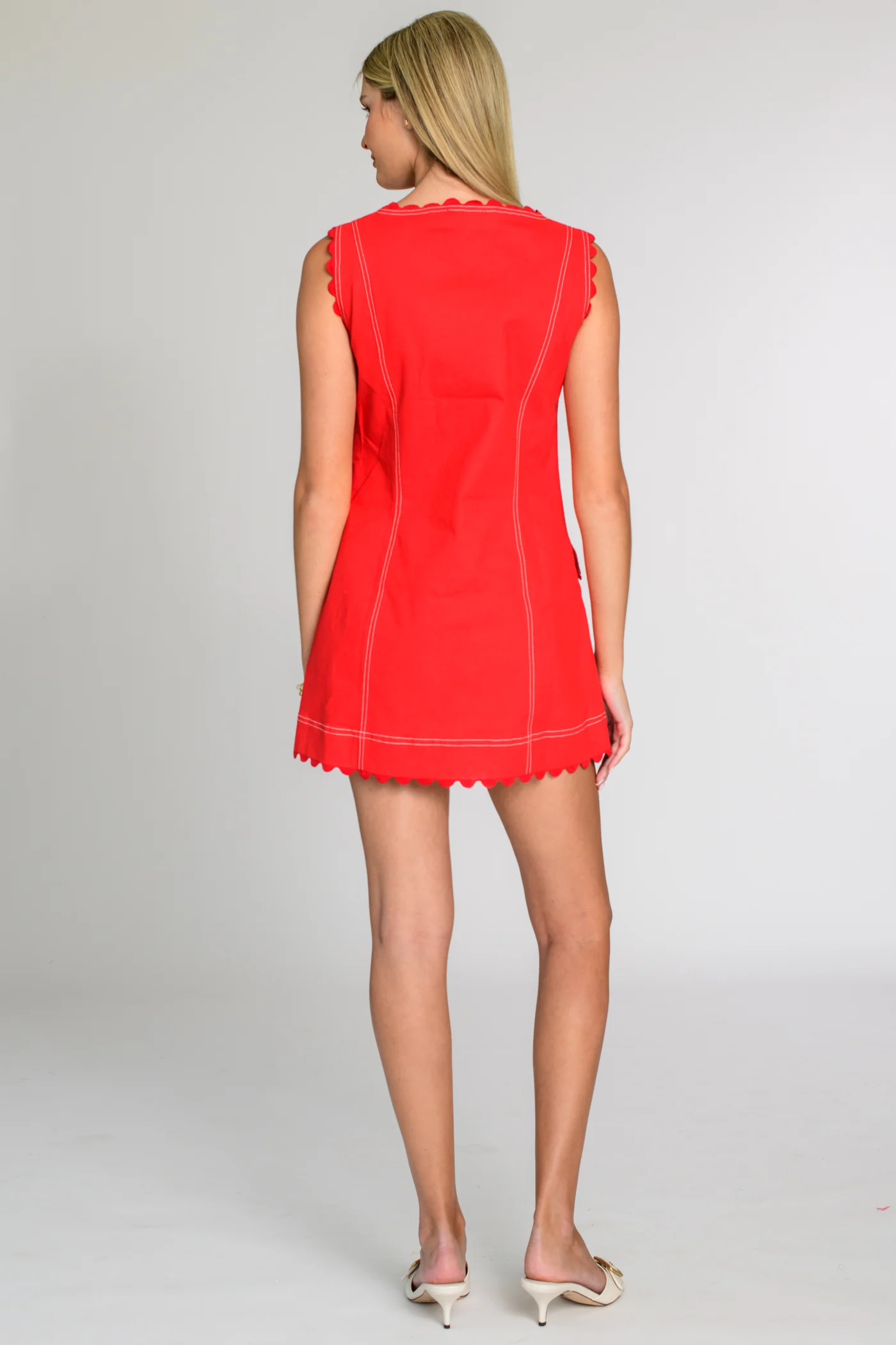 Rory is all the rage this season, especially in this poppy red stretch twill fabric. She has the silhouette of a shift dress with a button front, welt pockets, ric rac trim, and white stitching accents.