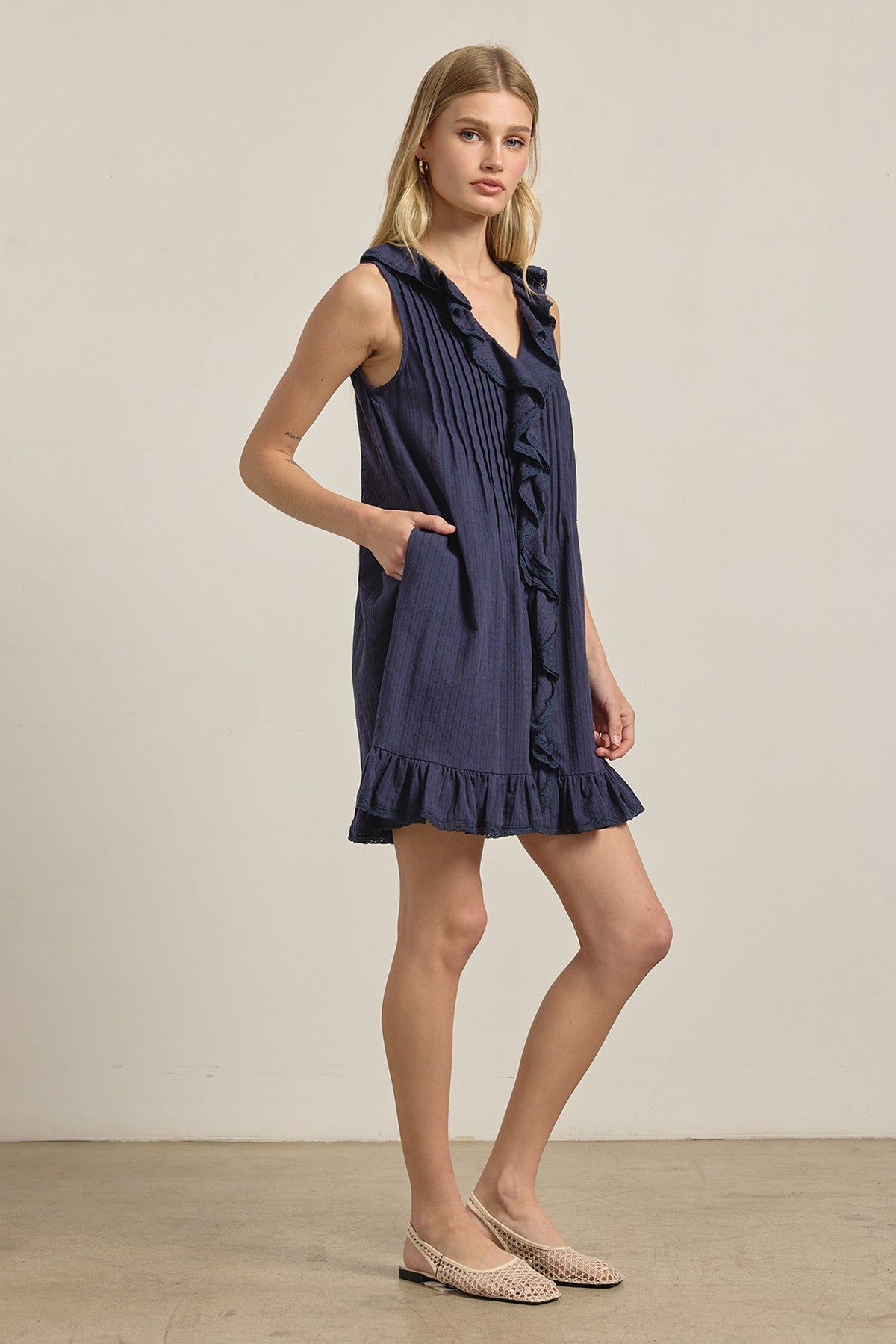 Ruffle Trim Pintuck Dress With Slip Lining